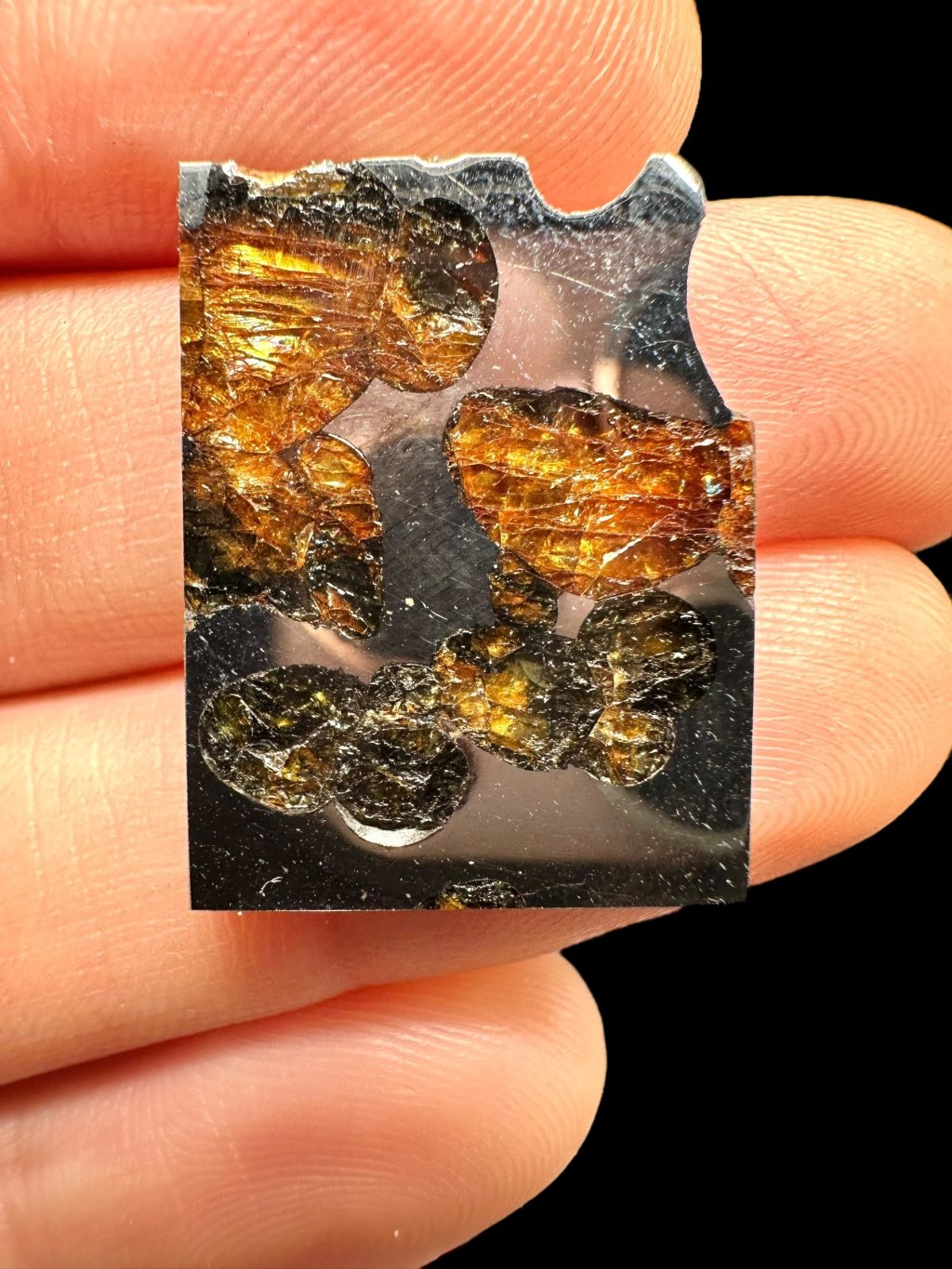 The Borzya meteorite was found in May 2021 in the Zabaikalsky region of Russia (near the town of Borzya). This meteorite is classified as a main group pallasite. It consists of rounded olivine crystals of 0.3 × 1 cm surrounded by iron-nickel alloys. The olivine crystals are mostly free of inclusions, but some contain finely interconnected chromite needles and calcium pyroxene.
