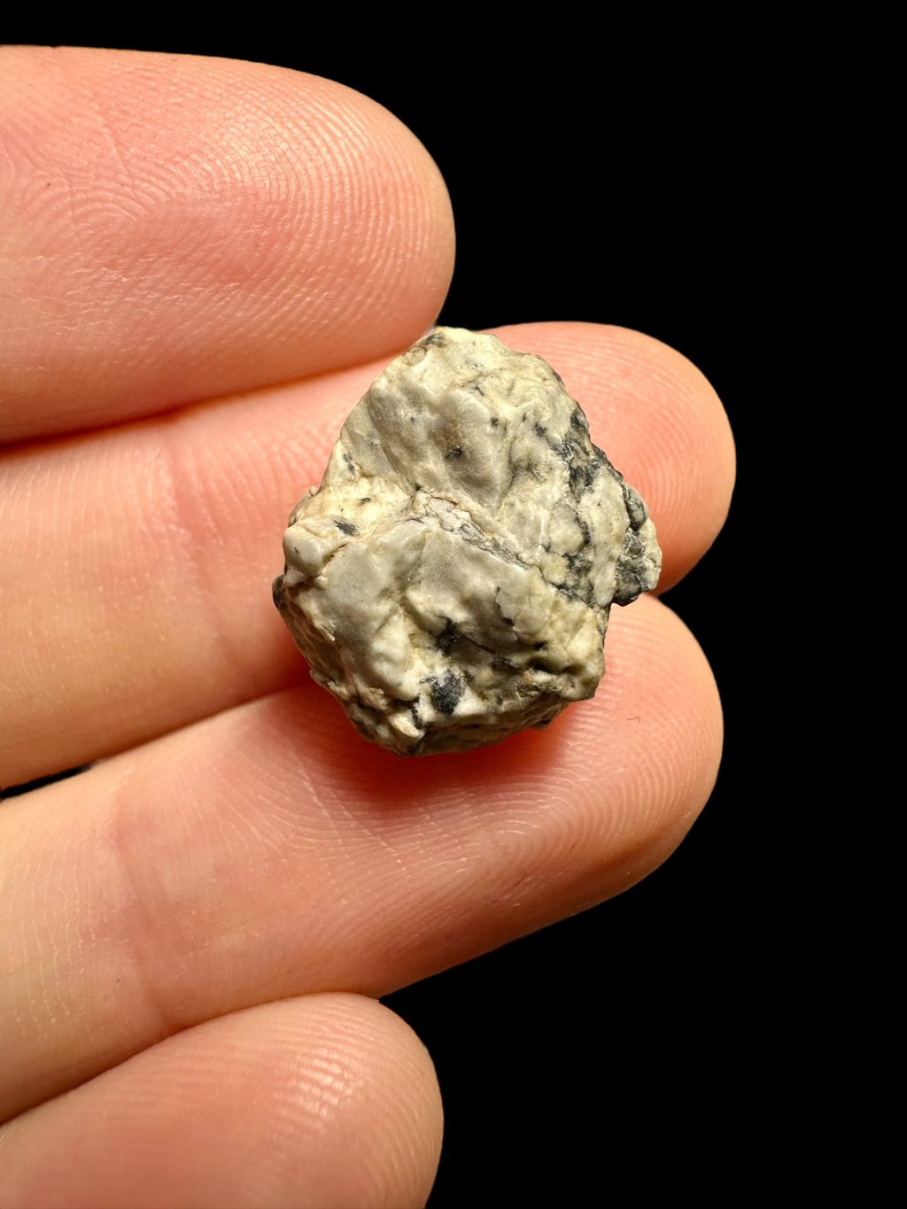 Djoua 001 has a pale exterior with black surface coatings, likely representing degraded fusion crust formed during atmospheric entry. Its interior displays a marbled beige and grey pattern with occasional dark and rusty spots. Several scattered fragments were recovered, with a total mass exceeding 22.5 kg.