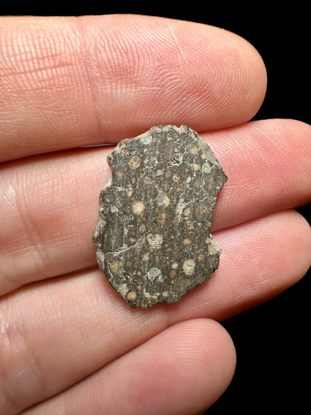 CR2 chondrites are a rare subgroup of stony meteorites. They contain large amounts of chondrules (spherical silicate bodies), metallic grains, fine matrix, and often presolar minerals. Erg Chech 003 is characterized by a high content of olivine and pyroxene in the chondrules and a relatively low degree of thermal alteration – suggesting that the parent body was never significantly melted.