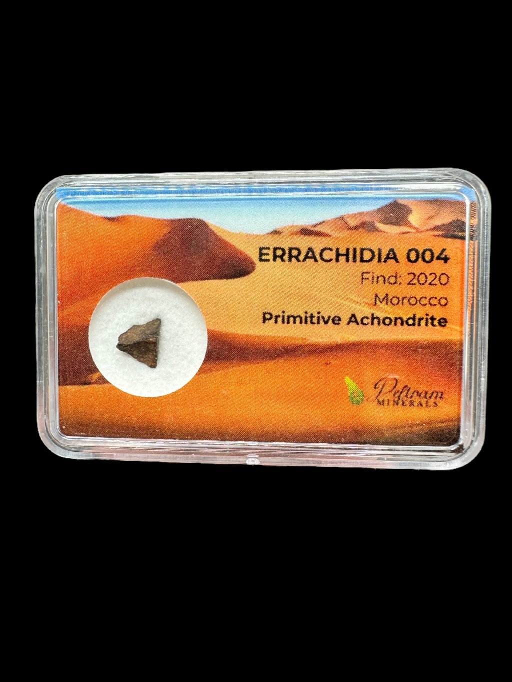 Errachidia 004 was discovered in 2020 in Morocco, in the Errachidida region. This meteorite is classified as a primitive achondrite of the winonaite group, indicating its ancient origin. The total recovered mass is approximately 2.64 kg. Winonaites have a complex formation history dating back to the early solar system.