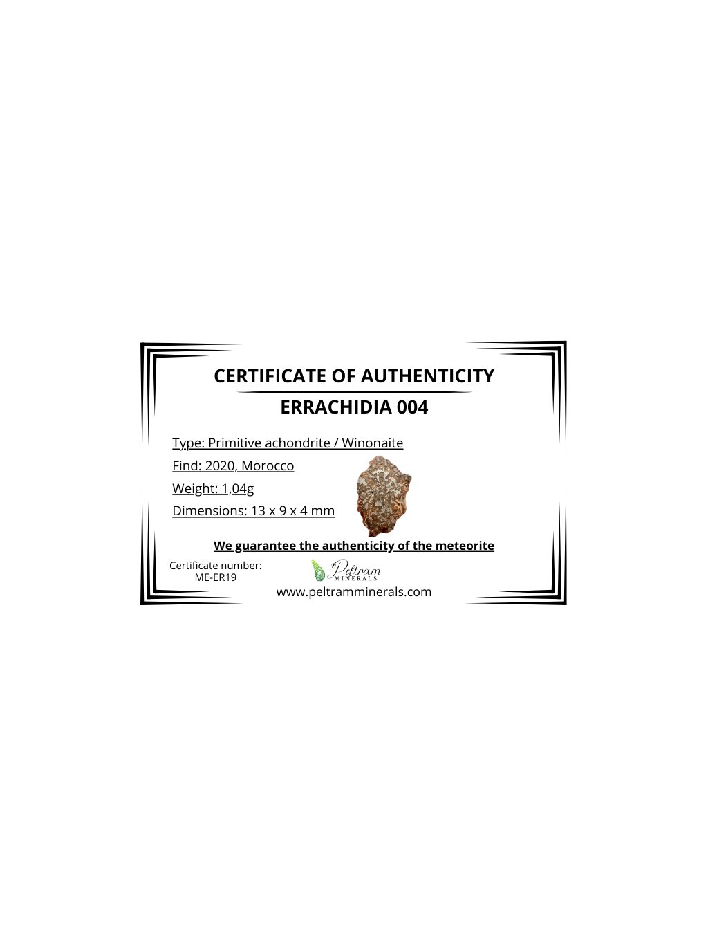 Errachidia 004 was discovered in 2020 in Morocco, in the Errachidida region. This meteorite is classified as a primitive achondrite of the winonaite group, indicating its ancient origin. The total recovered mass is approximately 2.64 kg. Winonaites have a complex formation history dating back to the early solar system.