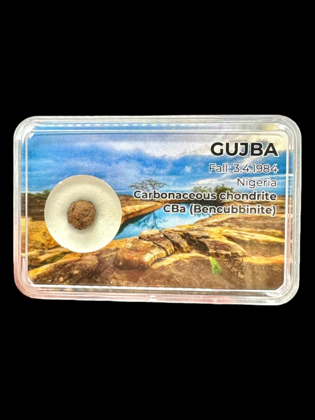 The Gujba meteorite is a rare carbonaceous chondrite of the CBa group, also known as a bencubbinite. It fell on April 3, 1984 near the village of Bogga Dingare in Yobe State, Nigeria. Witnesses described the event as a bright fireball moving west to east, followed by an explosion. The meteorite landed in a cornfield, where locals broke it into several pieces and took them as talismans. The exact original weight of the meteorite is unknown but is estimated to be around 100 kg.