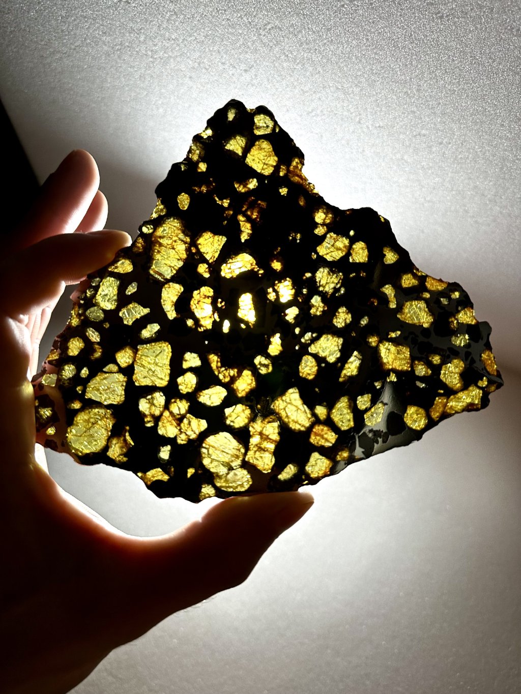 This piece is one of the largest pieces of Imilac found with this quality and size of olivine. The slice is polished on both sides. The largest olivine is over 2 cm!