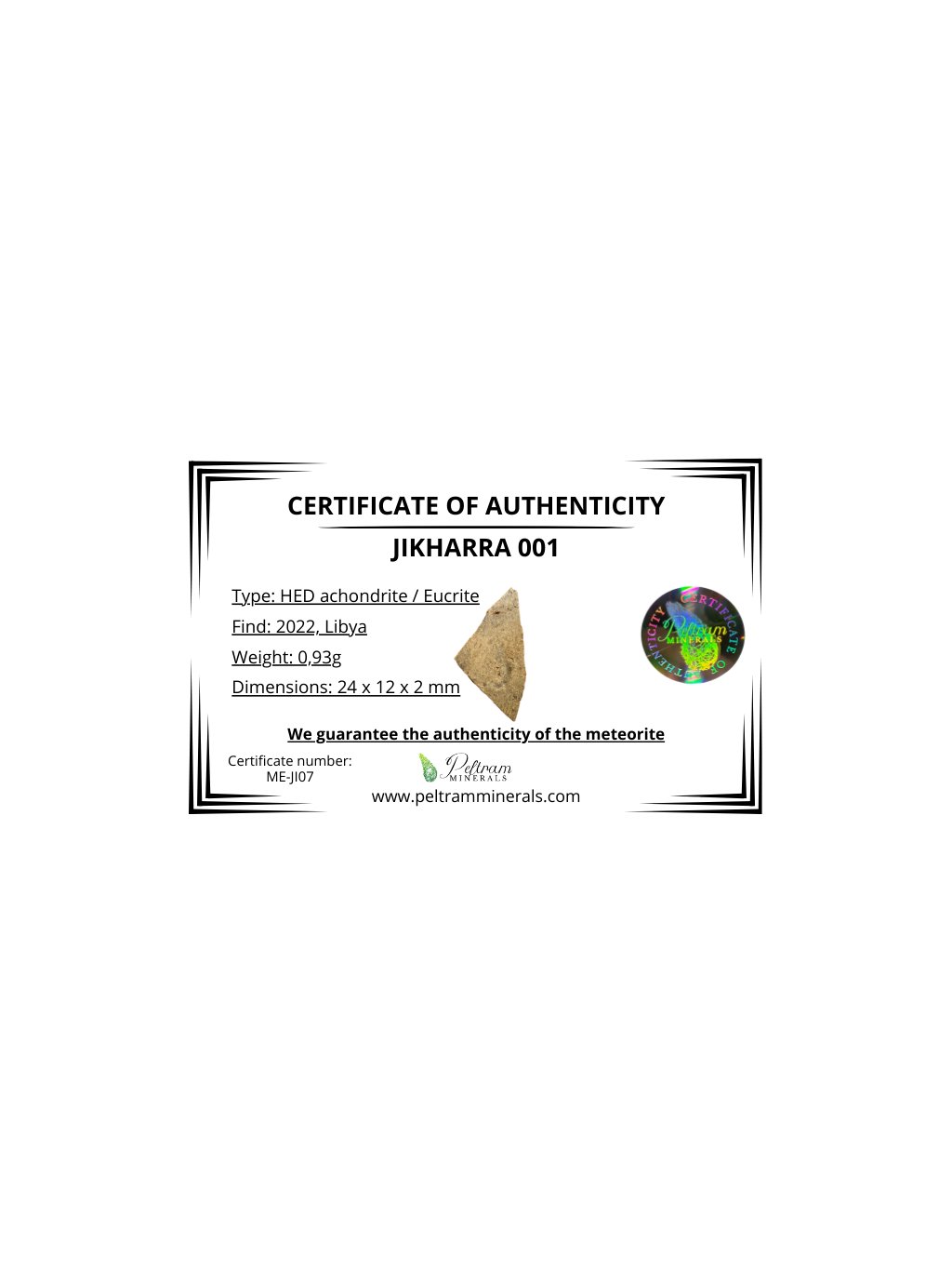 Jikharra 001 is a stony meteorite discovered in northeastern Libya in 2022. It is an HED-type achondrite, specifically a eucritic melt breccia. The total mass of recovered fragments exceeds 2.5 tons, making this discovery one of the largest known eucritic meteorites.