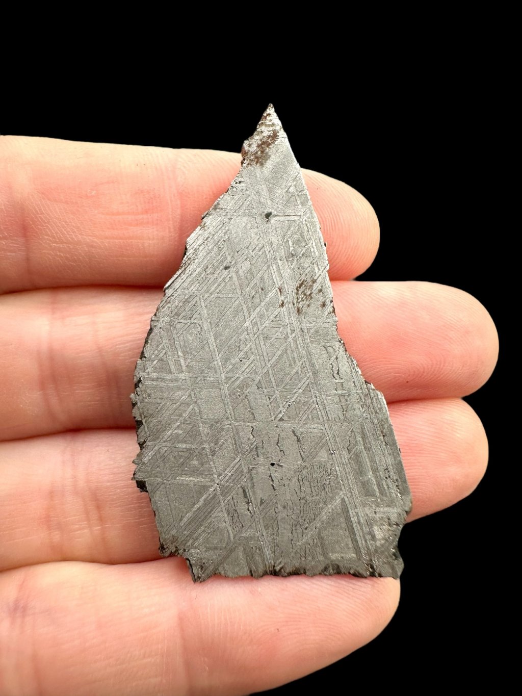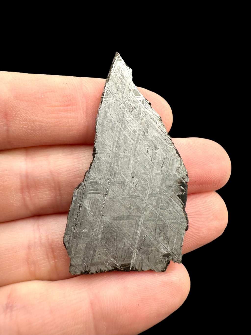 The first fragment of this meteorite was discovered in 1906, with others found during the 20th and 21st centuries, some weighing up to several hundred kilograms. It is classified as a fine octahedrite of type IVA and is especially known for its striking Widmanstätten patterns, which are irregular iron-nickel crystal structures. These patterns form through the slow cooling of metal in space. Not all iron meteorites display these patterns. To reveal them, the surface must be polished and etched with diluted nitric acid, preferably mixed with methanol.