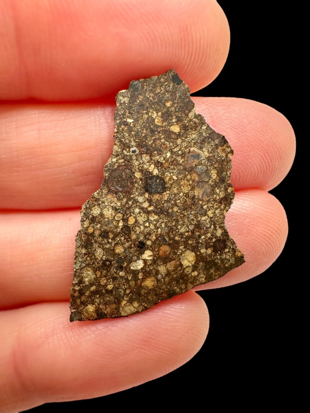 Structurally, it is a chondrite with distinct spherical chondrules embedded in a dark, fine-grained matrix. The low petrologic grade indicates that the meteorite underwent only minimal changes since its origin and has retained its original features from the early Solar System.