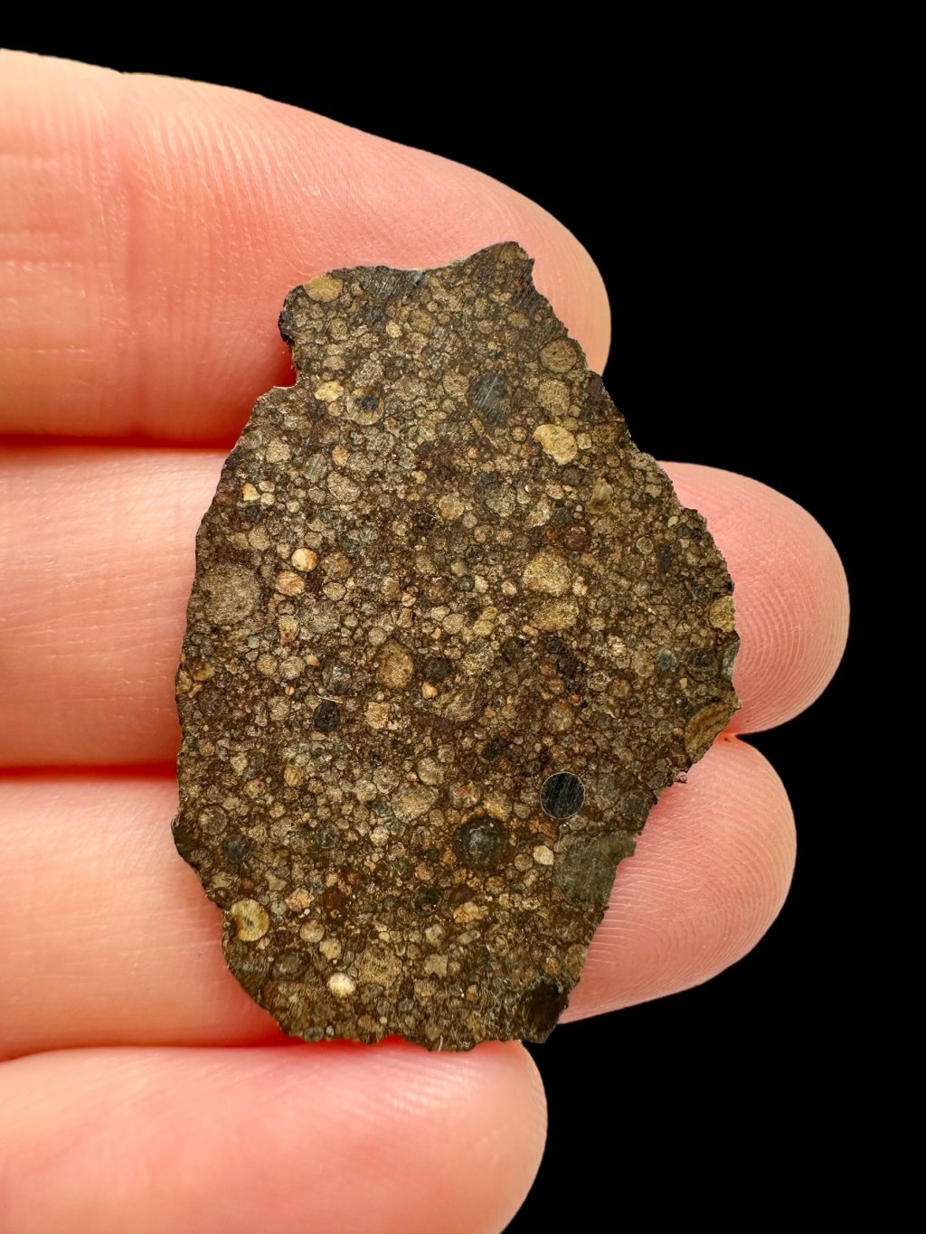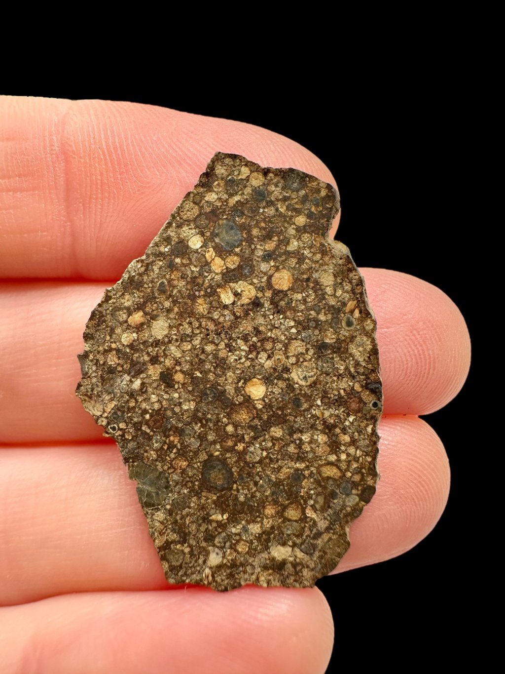 Structurally, it is a chondrite with distinct spherical chondrules embedded in a dark, fine-grained matrix. The low petrologic grade indicates that the meteorite underwent only minimal changes since its origin and has retained its original features from the early Solar System.