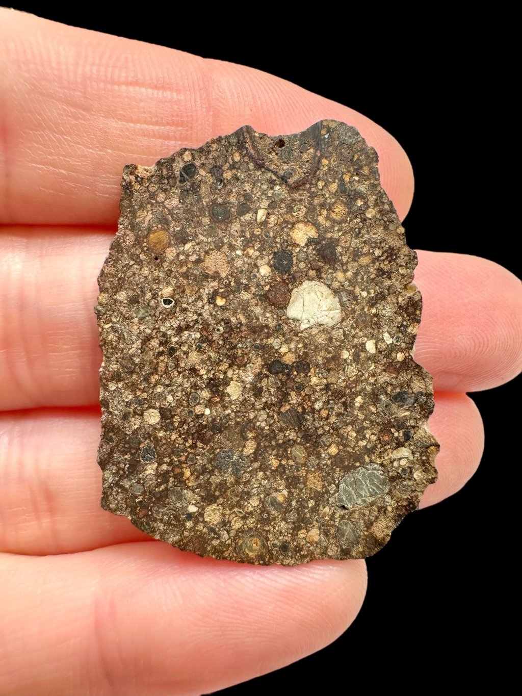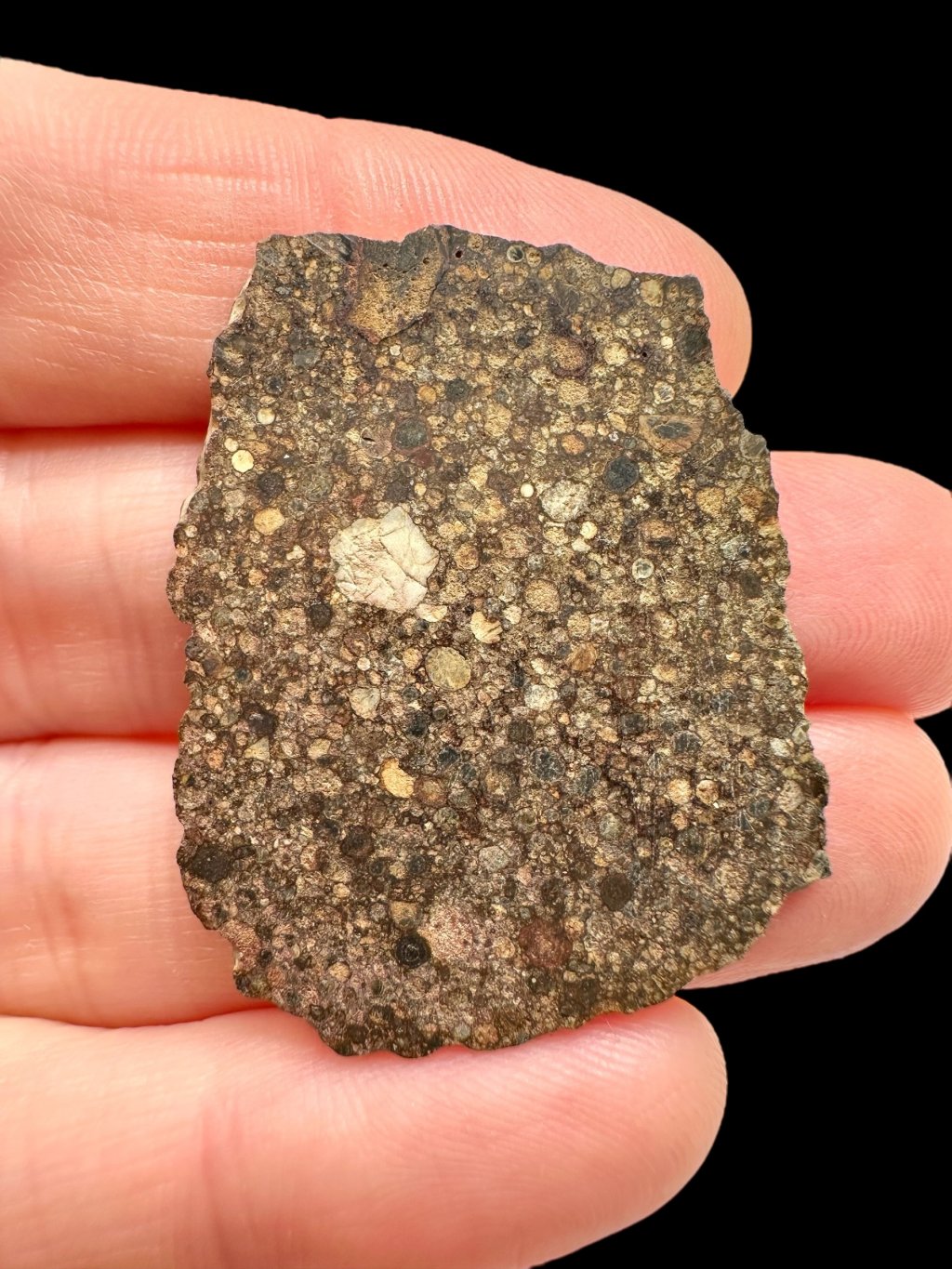 Structurally, it is a chondrite with distinct spherical chondrules embedded in a dark, fine-grained matrix. The low petrologic grade indicates that the meteorite underwent only minimal changes since its origin and has retained its original features from the early Solar System.