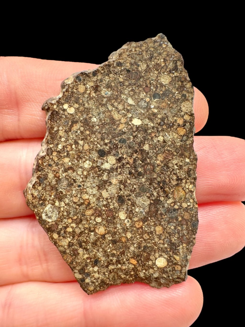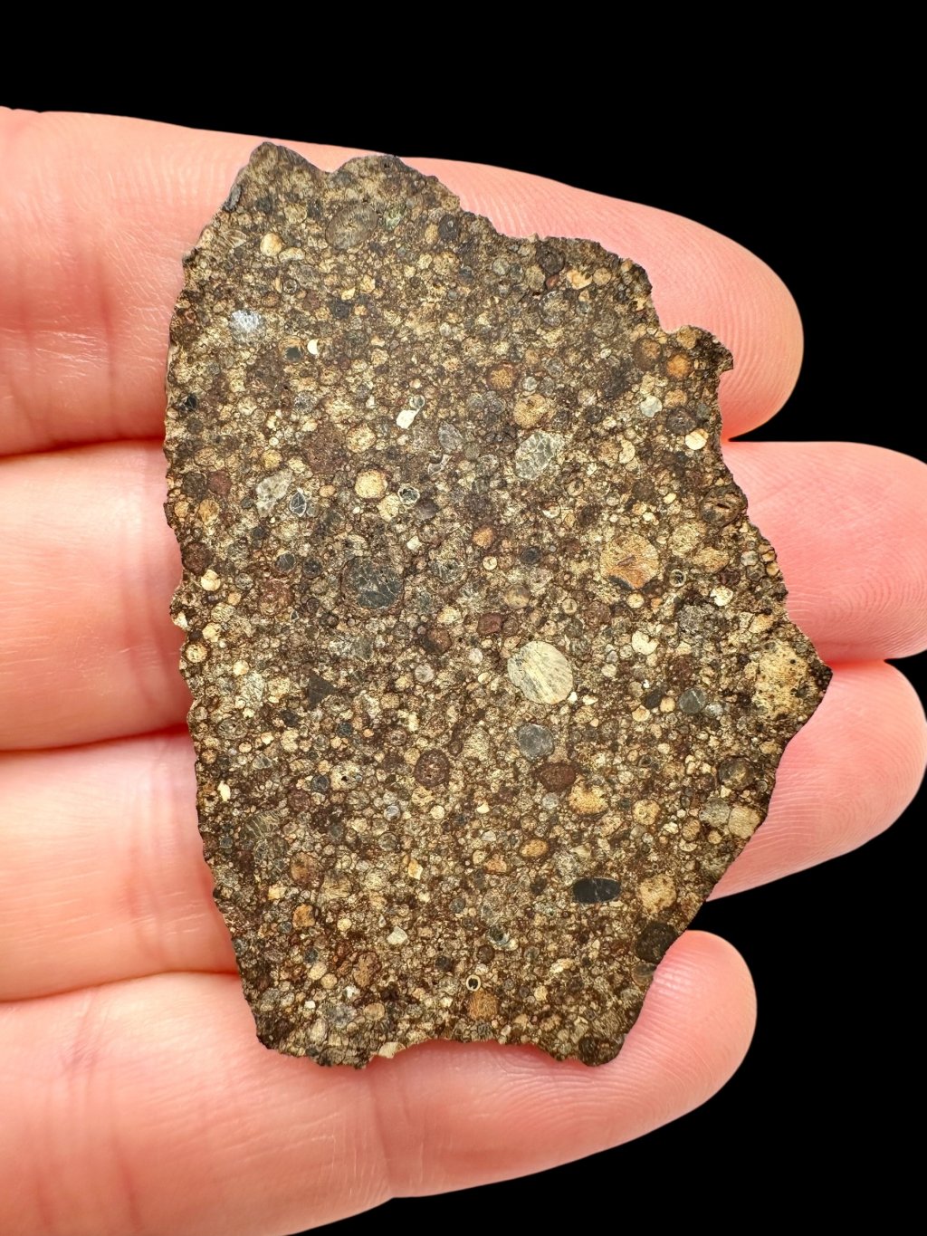 Structurally, it is a chondrite with distinct spherical chondrules embedded in a dark, fine-grained matrix. The low petrologic grade indicates that the meteorite underwent only minimal changes since its origin and has retained its original features from the early Solar System.