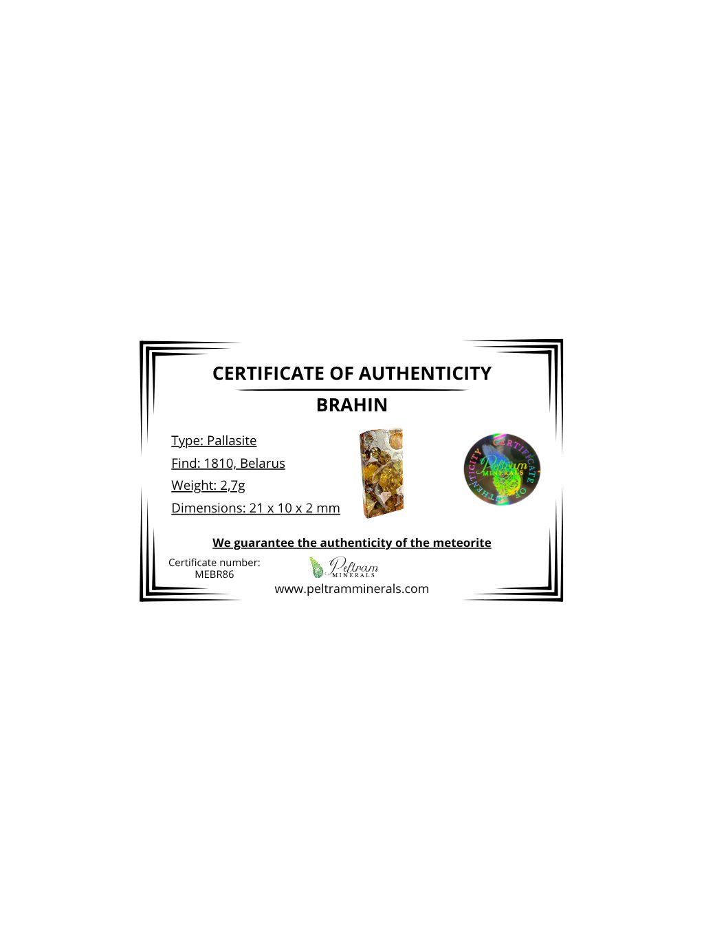 Meteorite Pallasit Brahin 2,7g – Extra Quality – Belarus