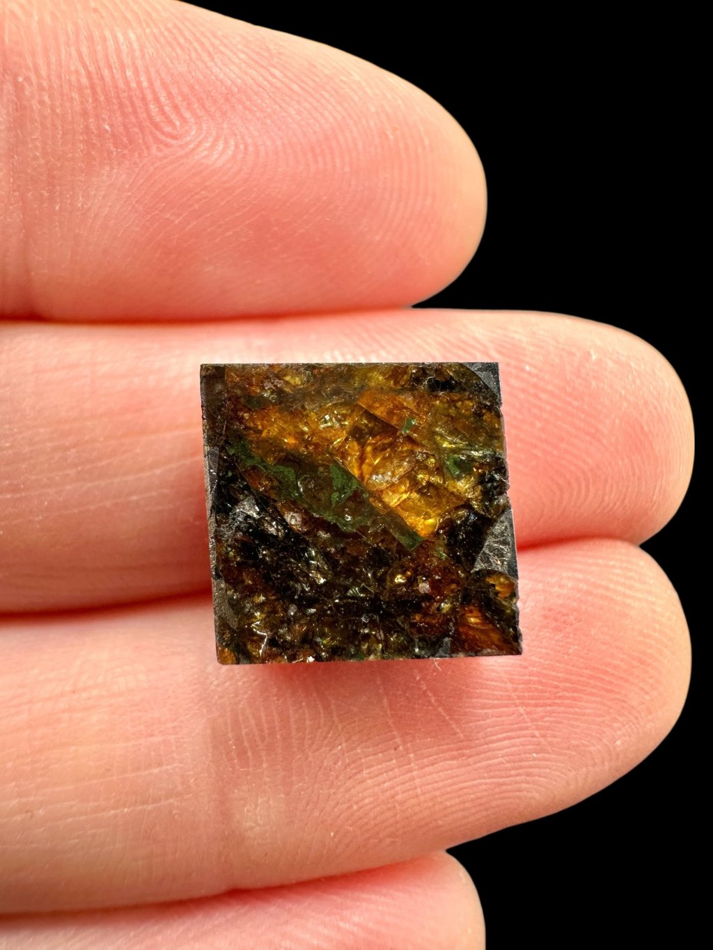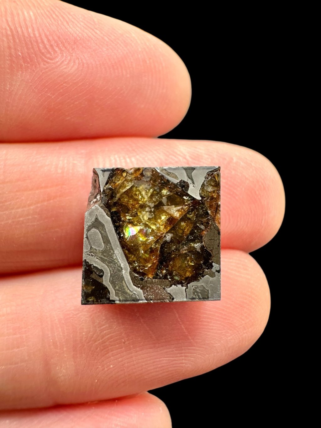 Pallasovka is composed approximately half of olivine—a translucent greenish-yellow mineral—and half of metallic iron-nickel. Its surface is distinctly covered with a dark brown fusion crust with regmaglypts, dimples formed during atmospheric entry.
