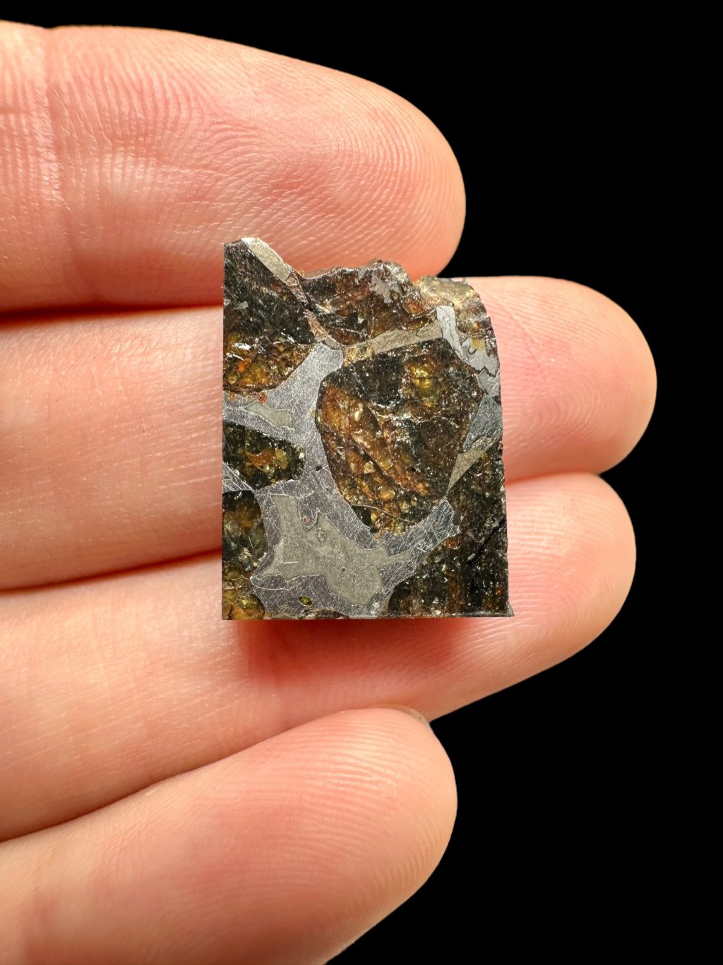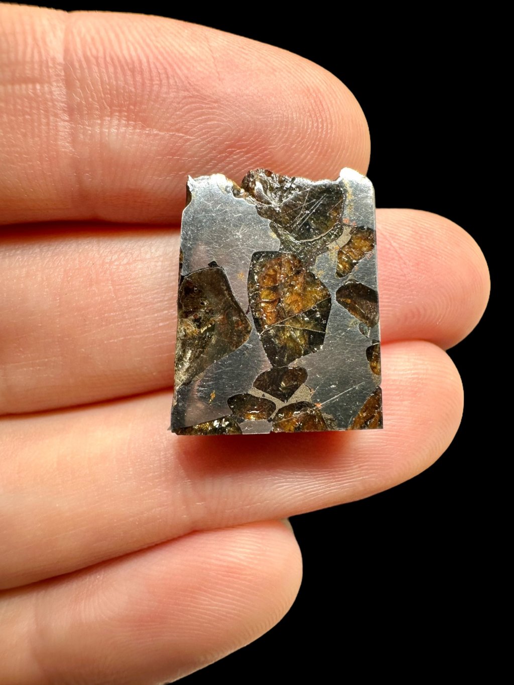 Pallasovka is composed approximately half of olivine—a translucent greenish-yellow mineral—and half of metallic iron-nickel. Its surface is distinctly covered with a dark brown fusion crust with regmaglypts, dimples formed during atmospheric entry.