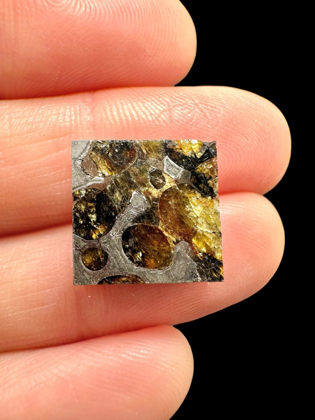 This stony-iron meteorite is characterized by a remarkable structure in which iron-nickel metallic alloys alternate with olivine crystals. These olivines are often transparent with a green-yellow hue and form irregular inclusions in the metallic matrix. This contrast gives the Springwater meteorite its striking visual appearance.