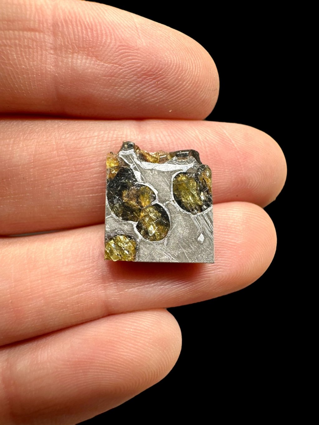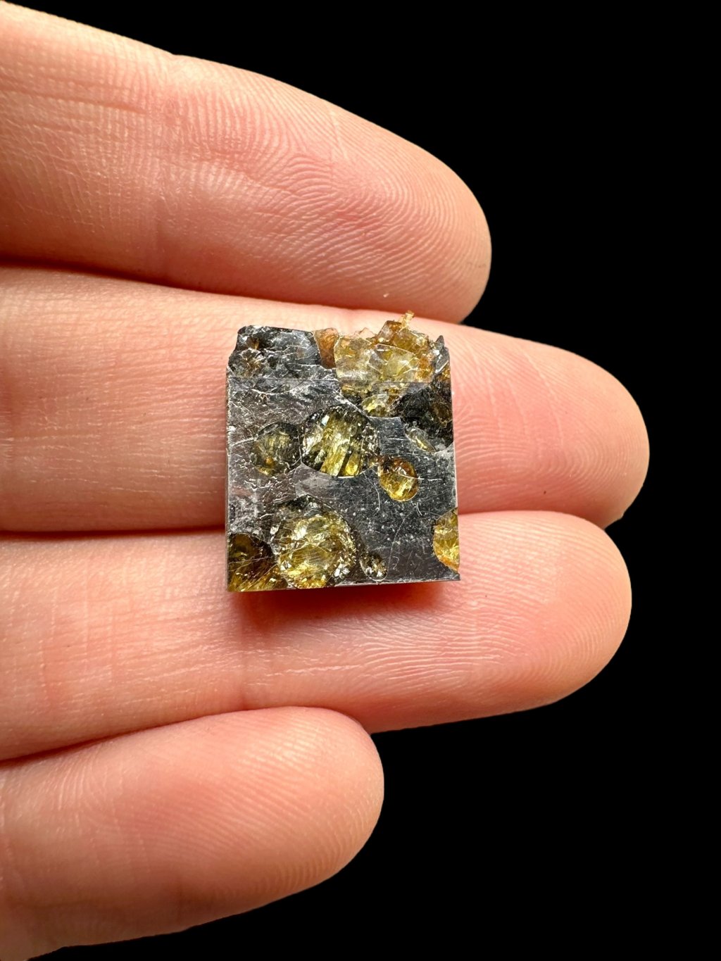 This stony-iron meteorite is characterized by a remarkable structure in which iron-nickel metallic alloys alternate with olivine crystals. These olivines are often transparent with a green-yellow hue and form irregular inclusions in the metallic matrix. This contrast gives the Springwater meteorite its striking visual appearance.