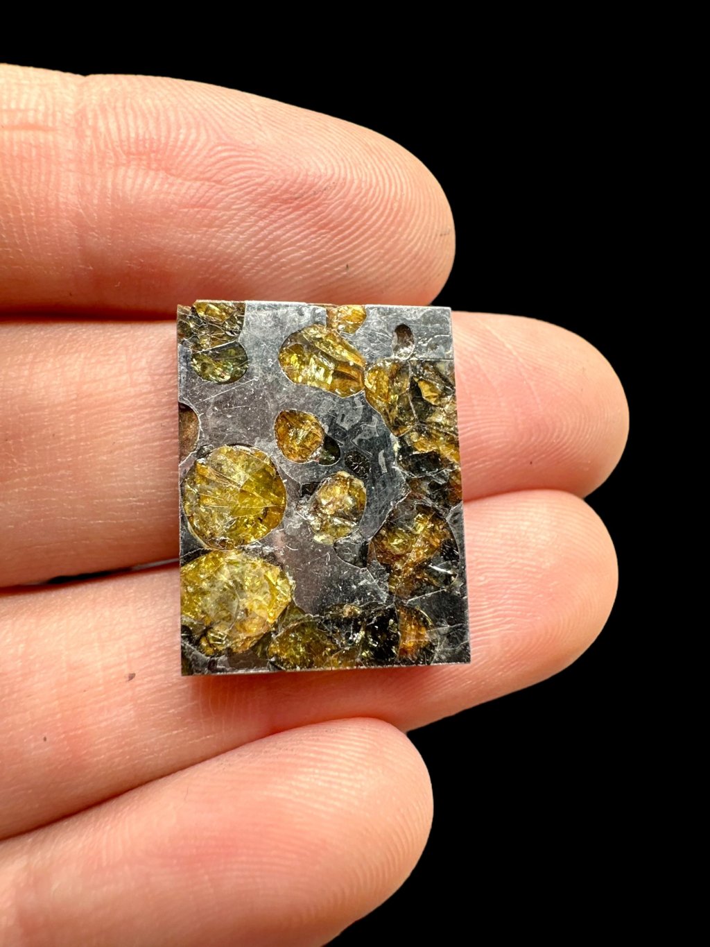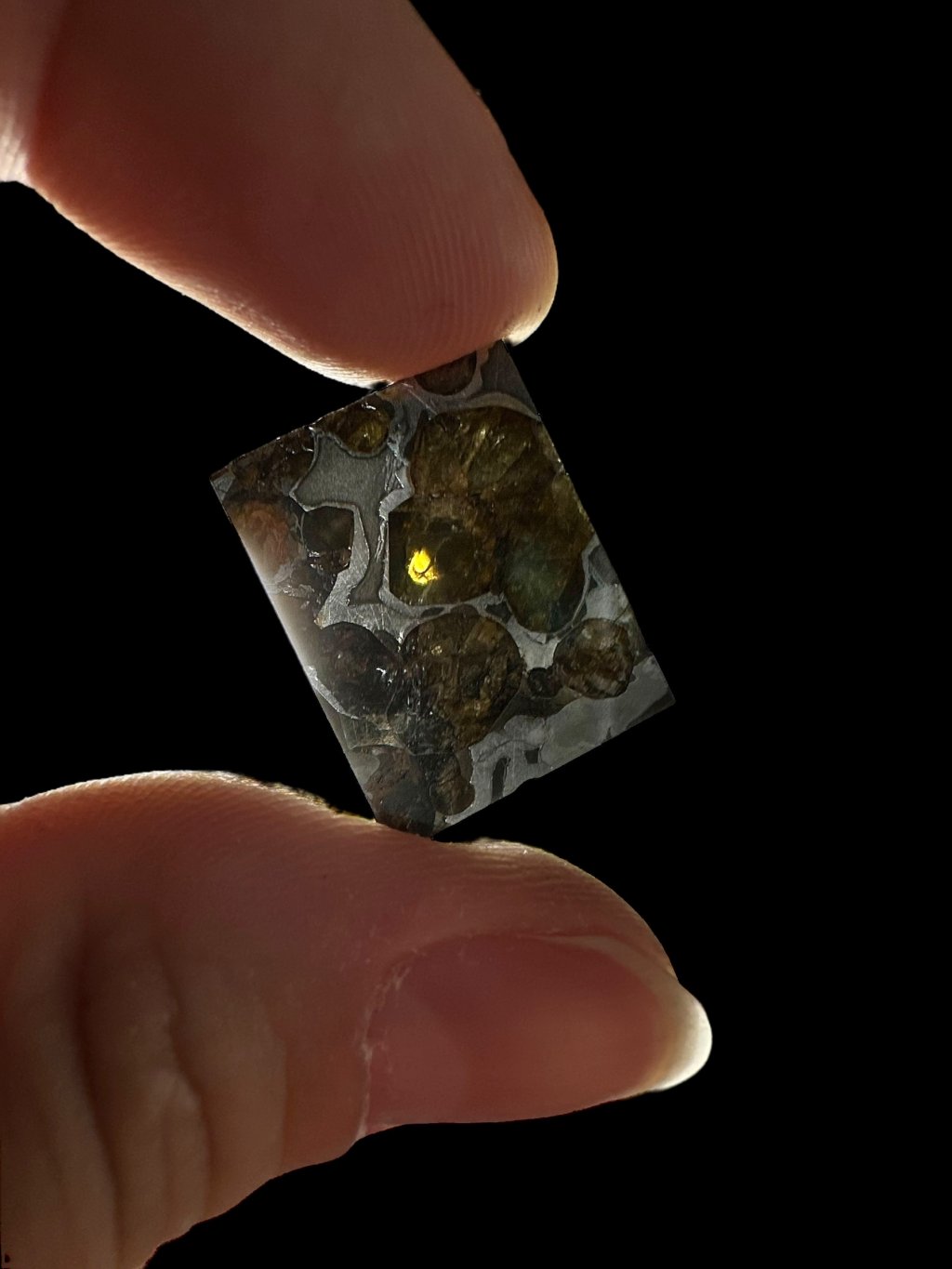 This stony-iron meteorite is characterized by a remarkable structure in which iron-nickel metallic alloys alternate with olivine crystals. These olivines are often transparent with a green-yellow hue and form irregular inclusions in the metallic matrix. This contrast gives the Springwater meteorite its striking visual appearance.