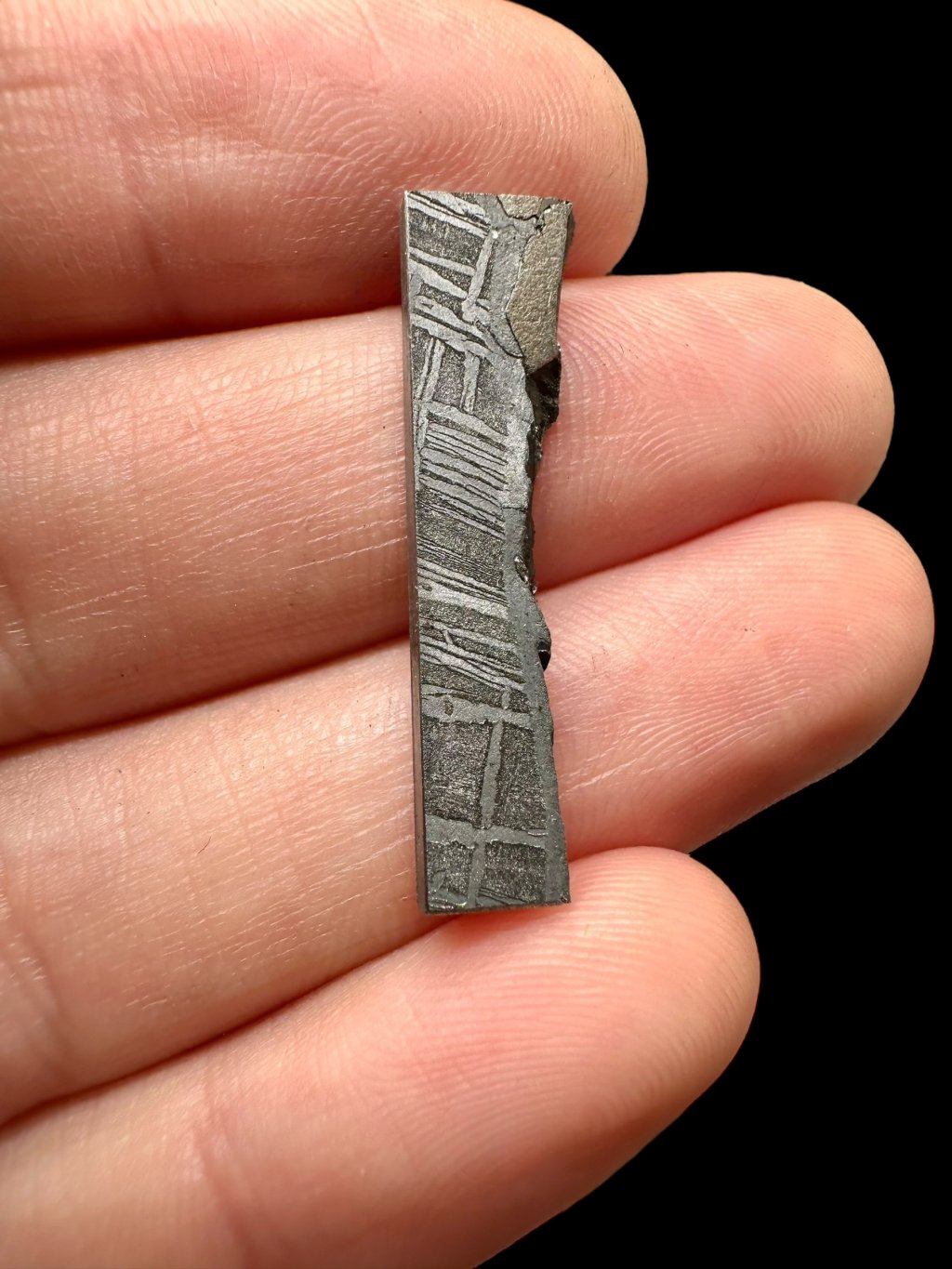Saint-Aubin is an iron meteorite with high nickel and gold content, but low in iridium. When cut and etched, it reveals very attractive Widmanstätten patterns. It also contains minerals like sarcopside or graftonite and schreibersite needles up to 6 cm long. Additionally, Saint-Aubin may show shock features such as Neumann lines and shock-twinned kamacite.
