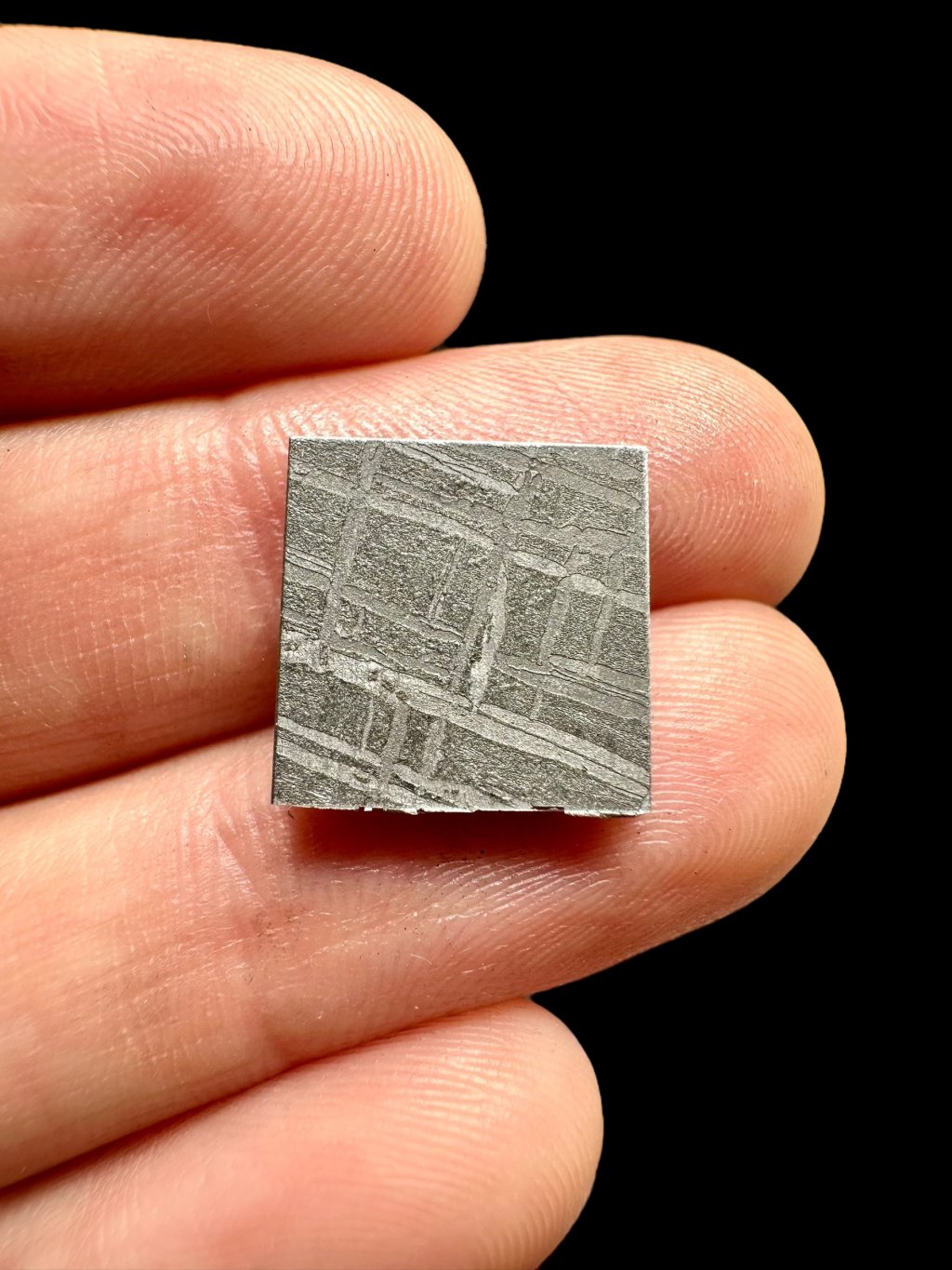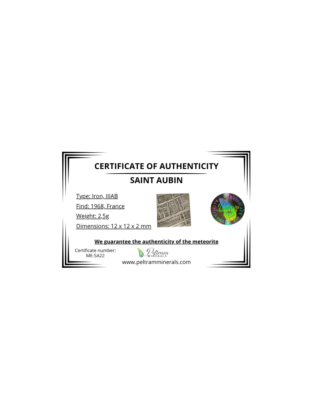 Saint-Aubin is an iron meteorite with high nickel and gold content, but low in iridium. When cut and etched, it reveals very attractive Widmanstätten patterns. It also contains minerals like sarcopside or graftonite and schreibersite needles up to 6 cm long. Additionally, Saint-Aubin may show shock features such as Neumann lines and shock-twinned kamacite.