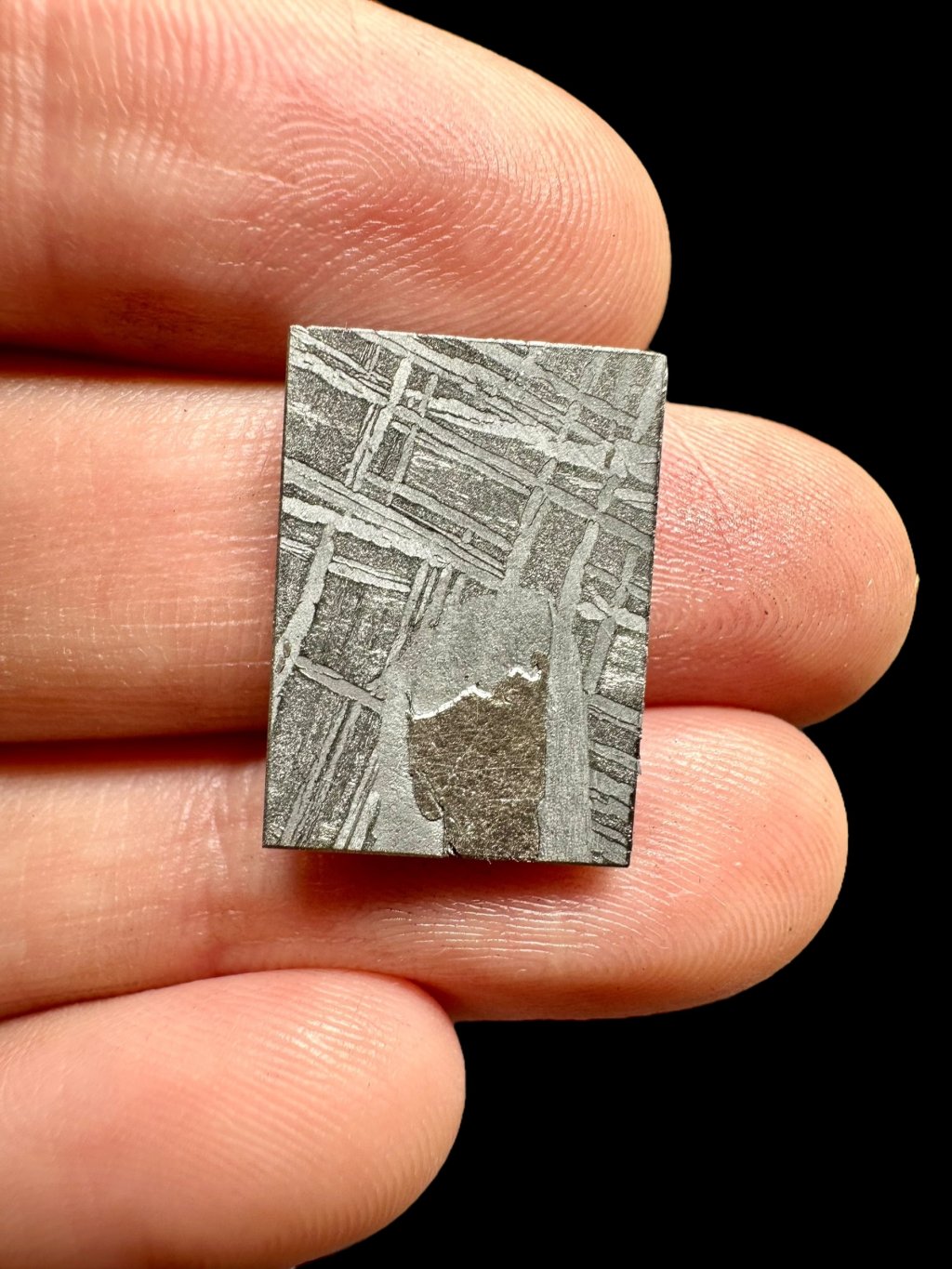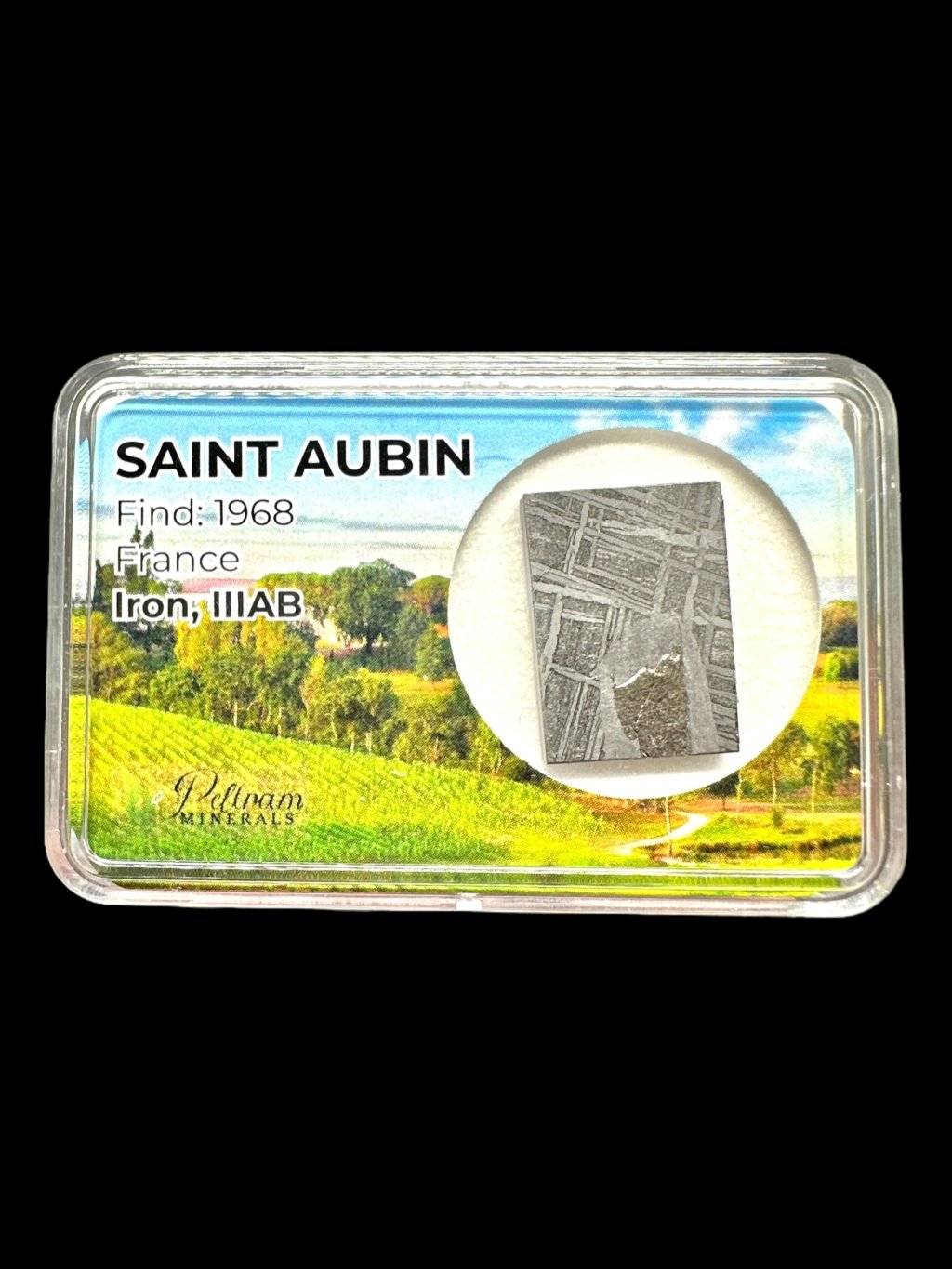 Saint-Aubin is an iron meteorite with high nickel and gold content, but low in iridium. When cut and etched, it reveals very attractive Widmanstätten patterns. It also contains minerals like sarcopside or graftonite and schreibersite needles up to 6 cm long. Additionally, Saint-Aubin may show shock features such as Neumann lines and shock-twinned kamacite.