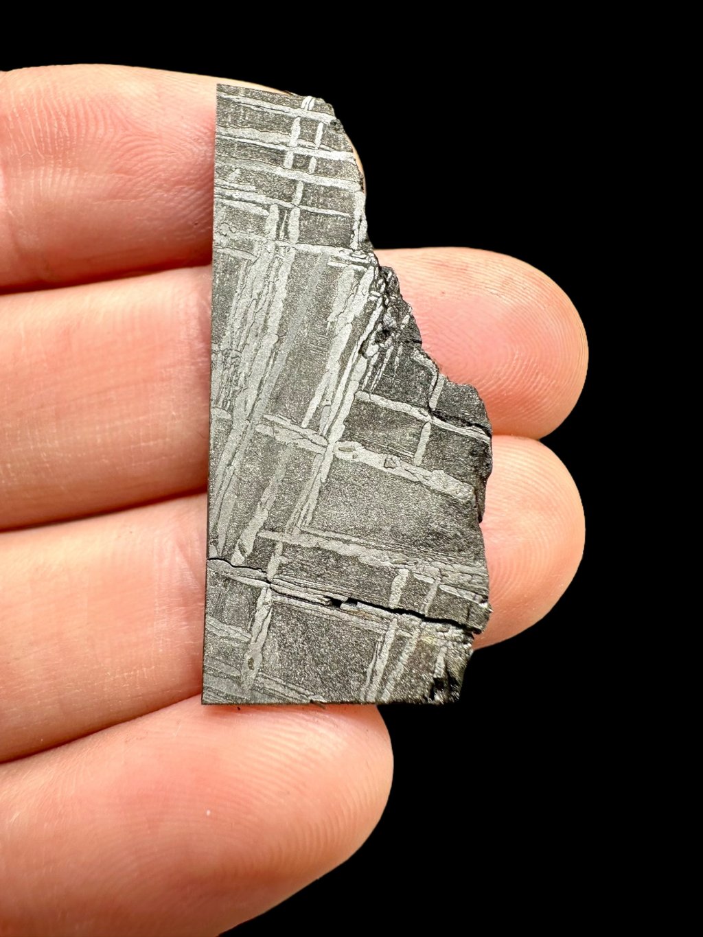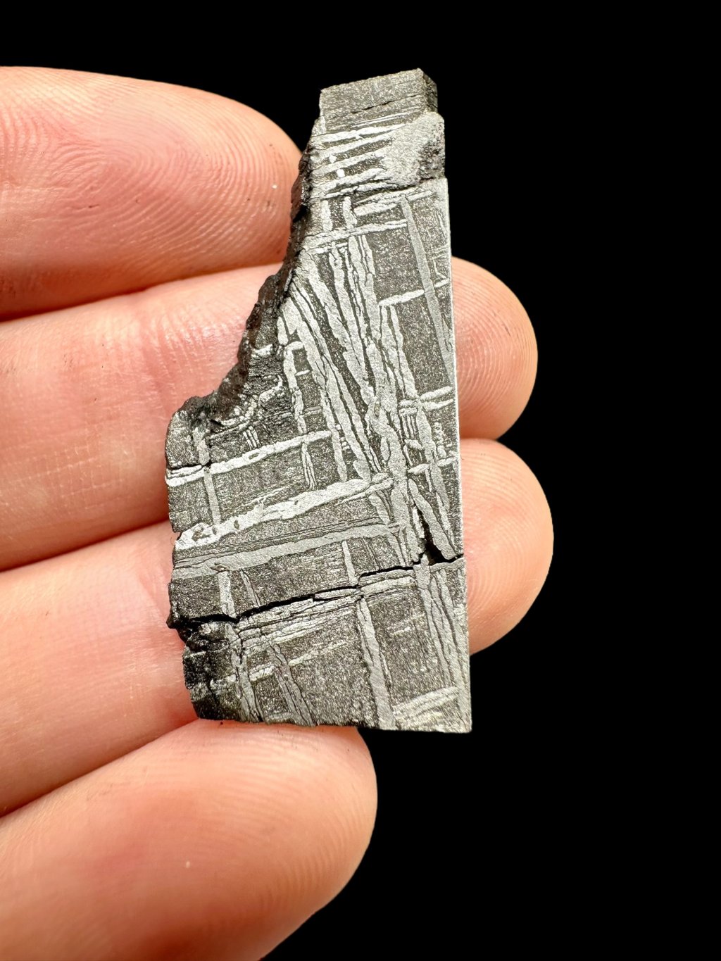 Saint-Aubin is an iron meteorite with high nickel and gold content, but low in iridium. When cut and etched, it reveals very attractive Widmanstätten patterns. It also contains minerals like sarcopside or graftonite and schreibersite needles up to 6 cm long. Additionally, Saint-Aubin may show shock features such as Neumann lines and shock-twinned kamacite.
