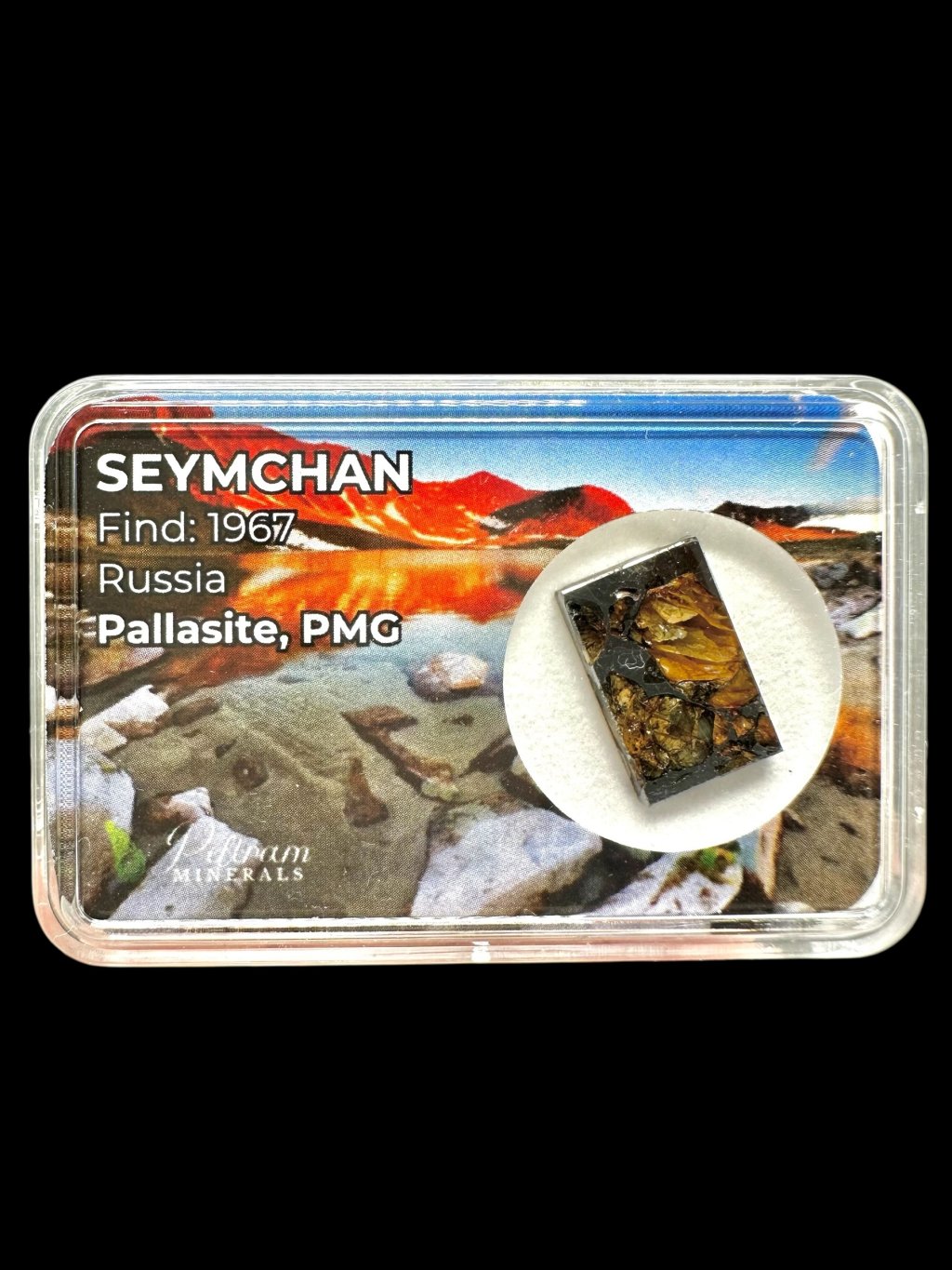 The Seymchan meteorite fell in the Magadan region near the settlement of Seymchan in Russia, though the exact fall date remains unknown. It was discovered in 1967, with a 272 kg mass found in June and another 51 kg mass in October. Initially, only metallic parts were discovered, classifying it as an iron meteorite of type IIE. Only in 2004 was it determined that 20% of the samples contained olivine crystals, leading to its classification as a pallasite.Internal structure
