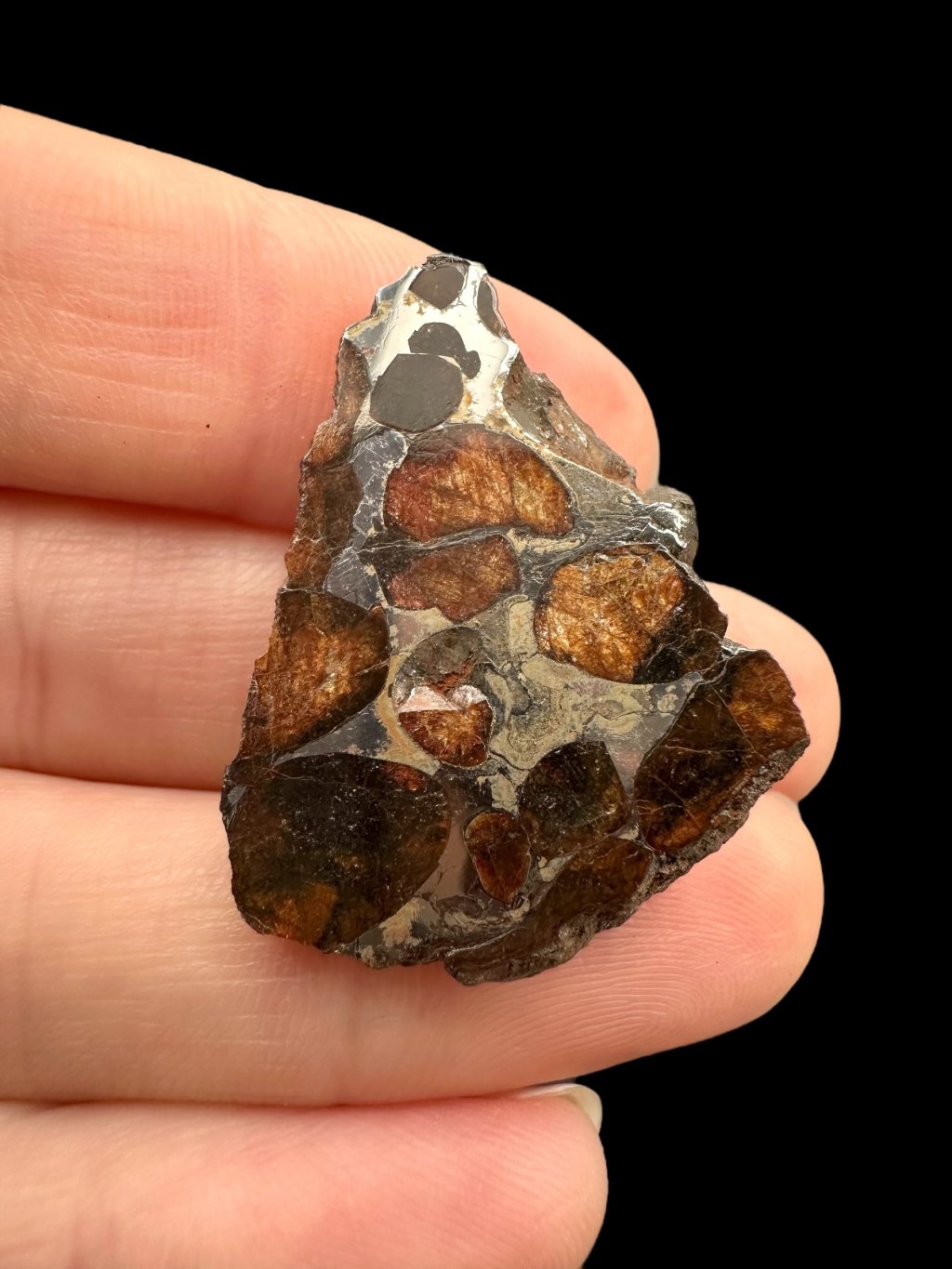 From the perspective of its origin, the meteorite comes from a differentiated asteroid in the main belt between Mars and Jupiter, which underwent melting and internal separation during its early development. Heavier elements such as iron and nickel settled into the core, while lighter silicate minerals formed the mantle. Due to later collisions and dynamic processes, metallic and silicate components became mixed. The result is a unique meteorite containing both purely metallic sections and pallasitic parts rich in olivine crystals.