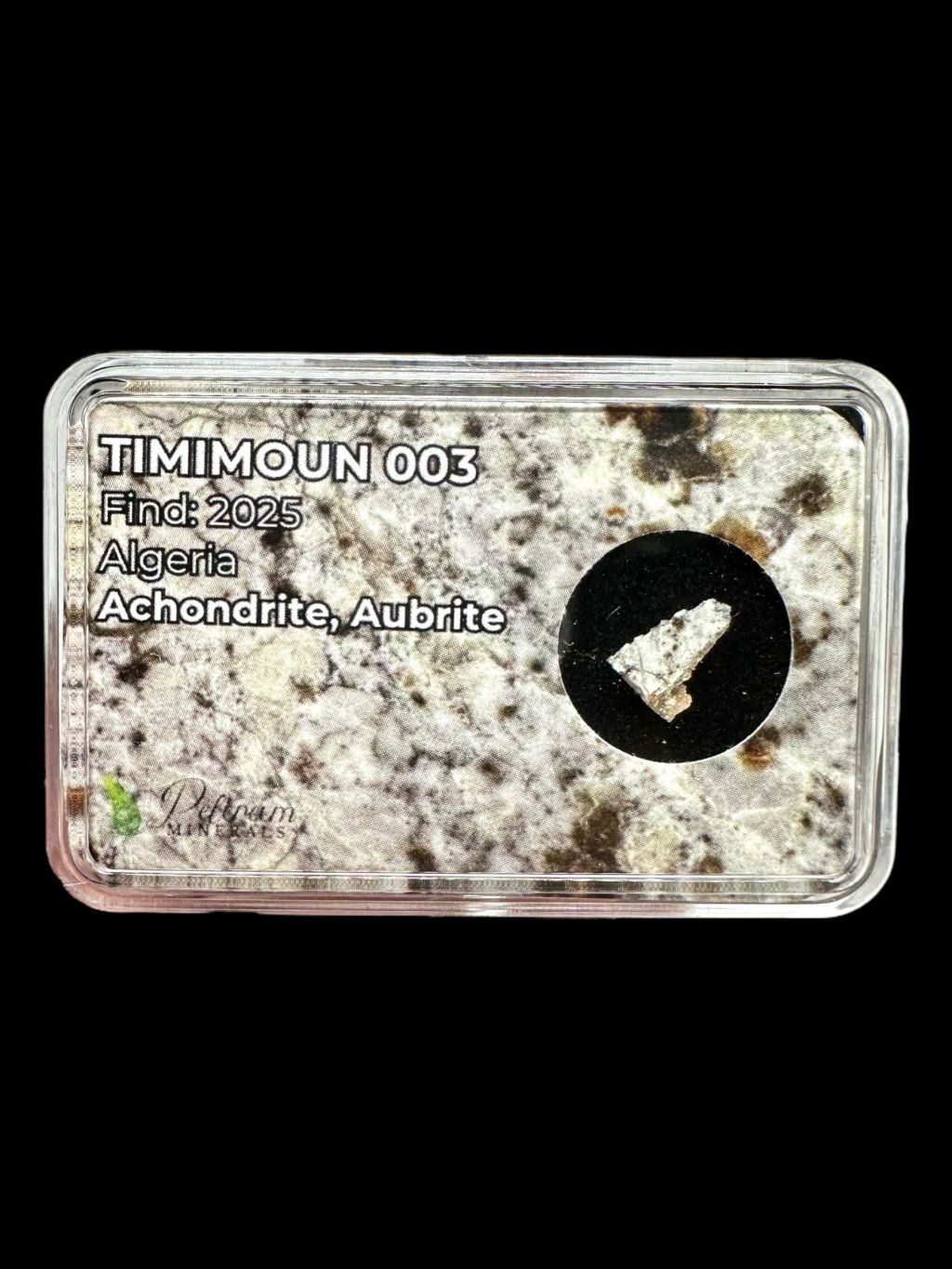 The Timimoun 003 meteorite represents one of the newest and most aesthetically striking finds of the rare aubrite achondrite. It was discovered in 2025 in the Timimoun region of the Algerian Sahara. The total known weight of the recovered material is approximately 26 kilograms.