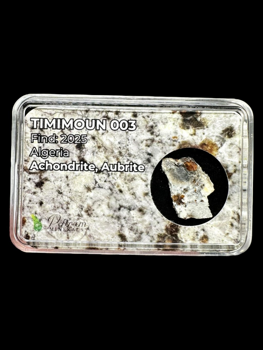 The Timimoun 003 meteorite represents one of the newest and most aesthetically striking finds of the rare aubrite achondrite. It was discovered in 2025 in the Timimoun region of the Algerian Sahara. The total known weight of the recovered material is approximately 26 kilograms.
