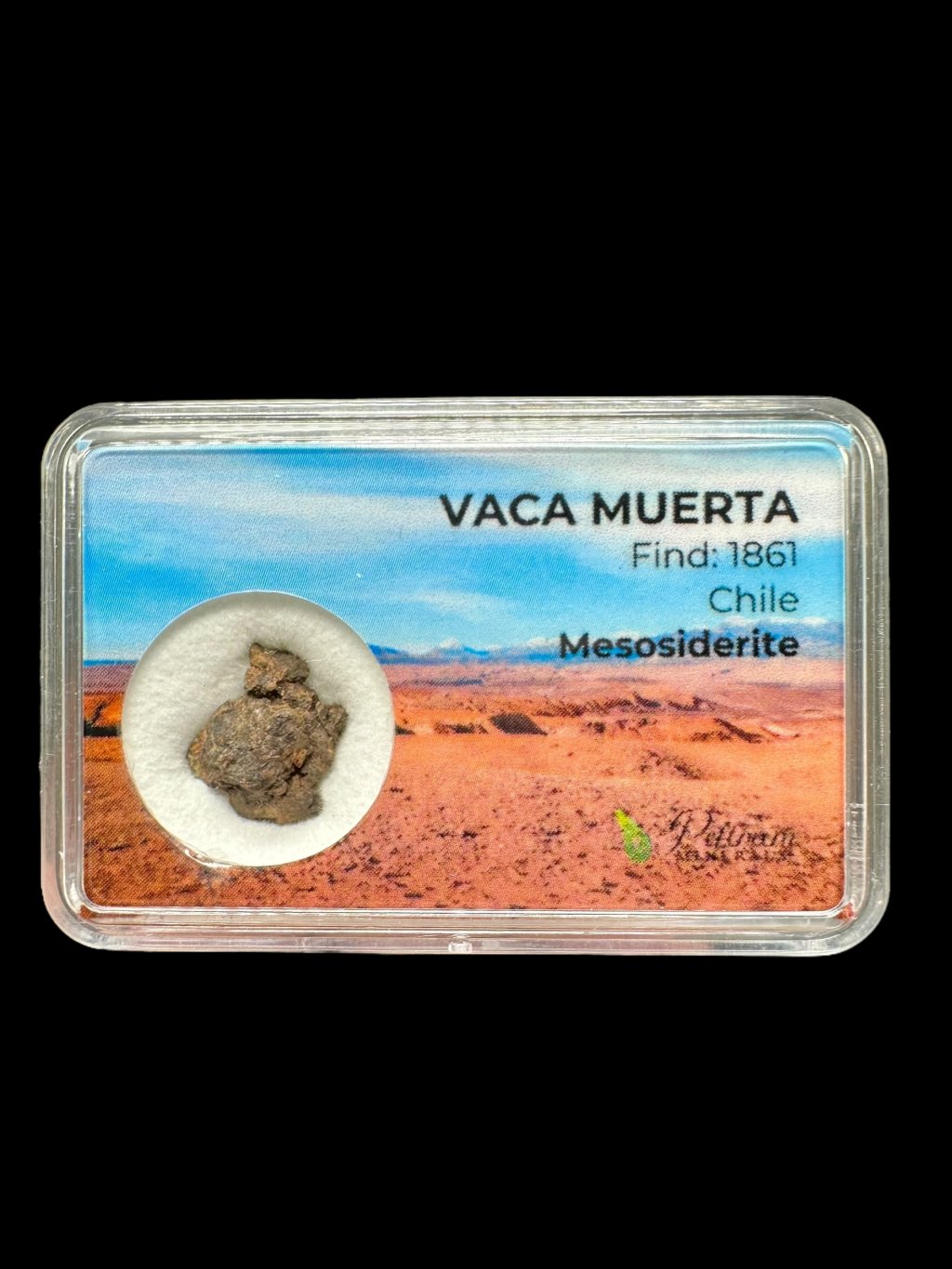 The Vaca Muerta meteorite was found in 1861 in Chile, specifically in the Atacama Desert region, which is known for its high concentration of meteorite finds. It got its special name ("dead cow") from a nearby riverbank where the skeletons of several dead cows lay. The meteorite was forgotten for more than 100 years before it was rediscovered in 1985. The main part of the meteorite formed a small crater several metres in diameter, which is still preserved today. The total amount of the Vaca Muerta meteorite found is approximately 3.8 tonnes.