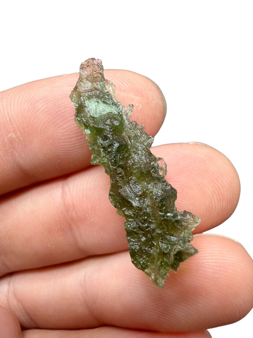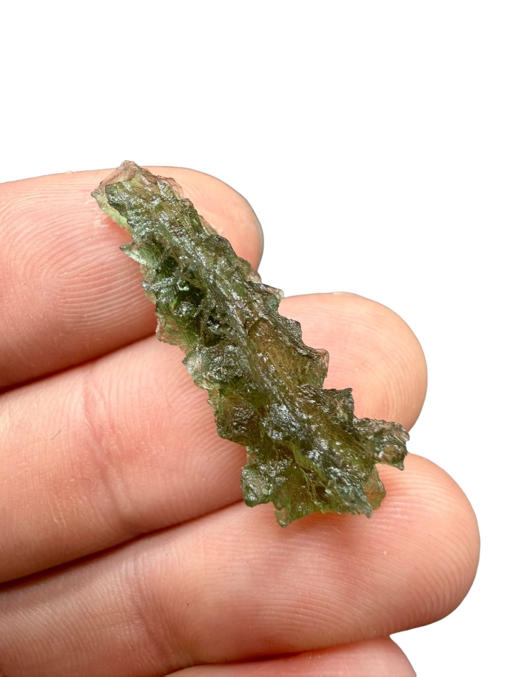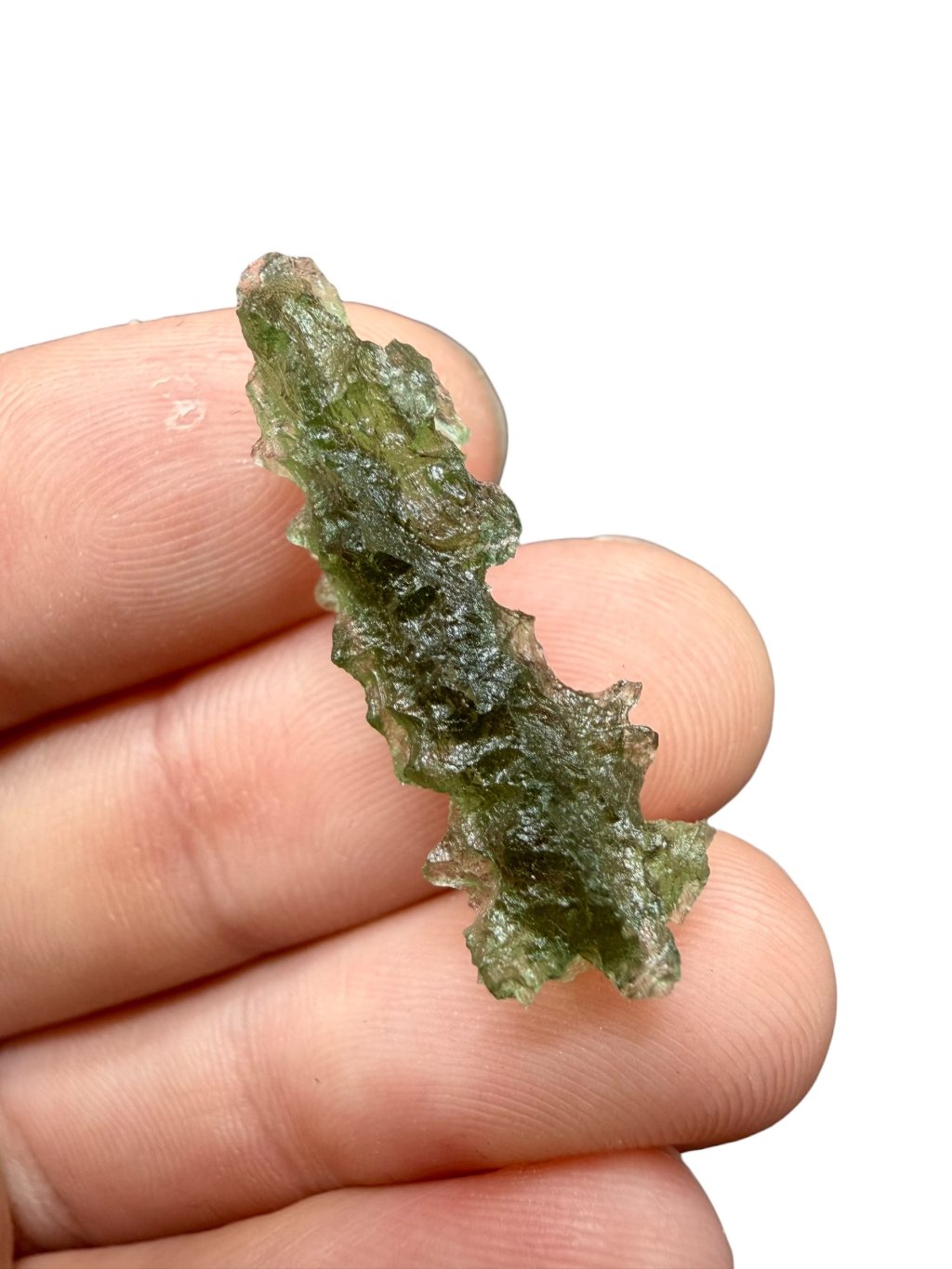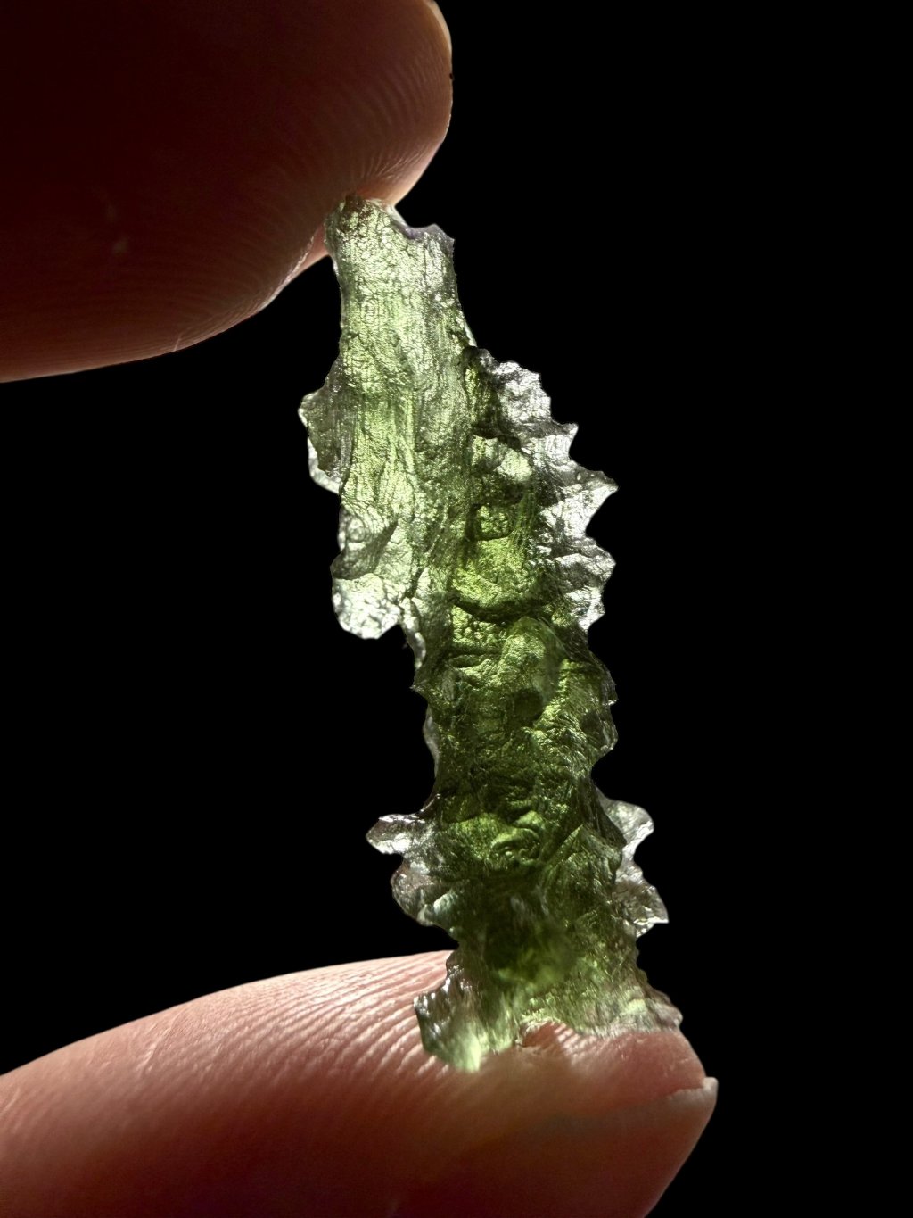 This moldavite comes from official mining in Besednice, where damage to the stones often occurred. The damaged glossy surfaces were then treated with acid to create a matte finish. These repaired moldavites are classified as lower quality, which is also reflected in their price, making them significantly cheaper and more affordable compared to undamaged moldavites. These stones are suitable both for jewellery and for collectors who appreciate a lower price for very beautiful pieces with the unique, deep structure of moldavites from the Besednice Jezkovna.
