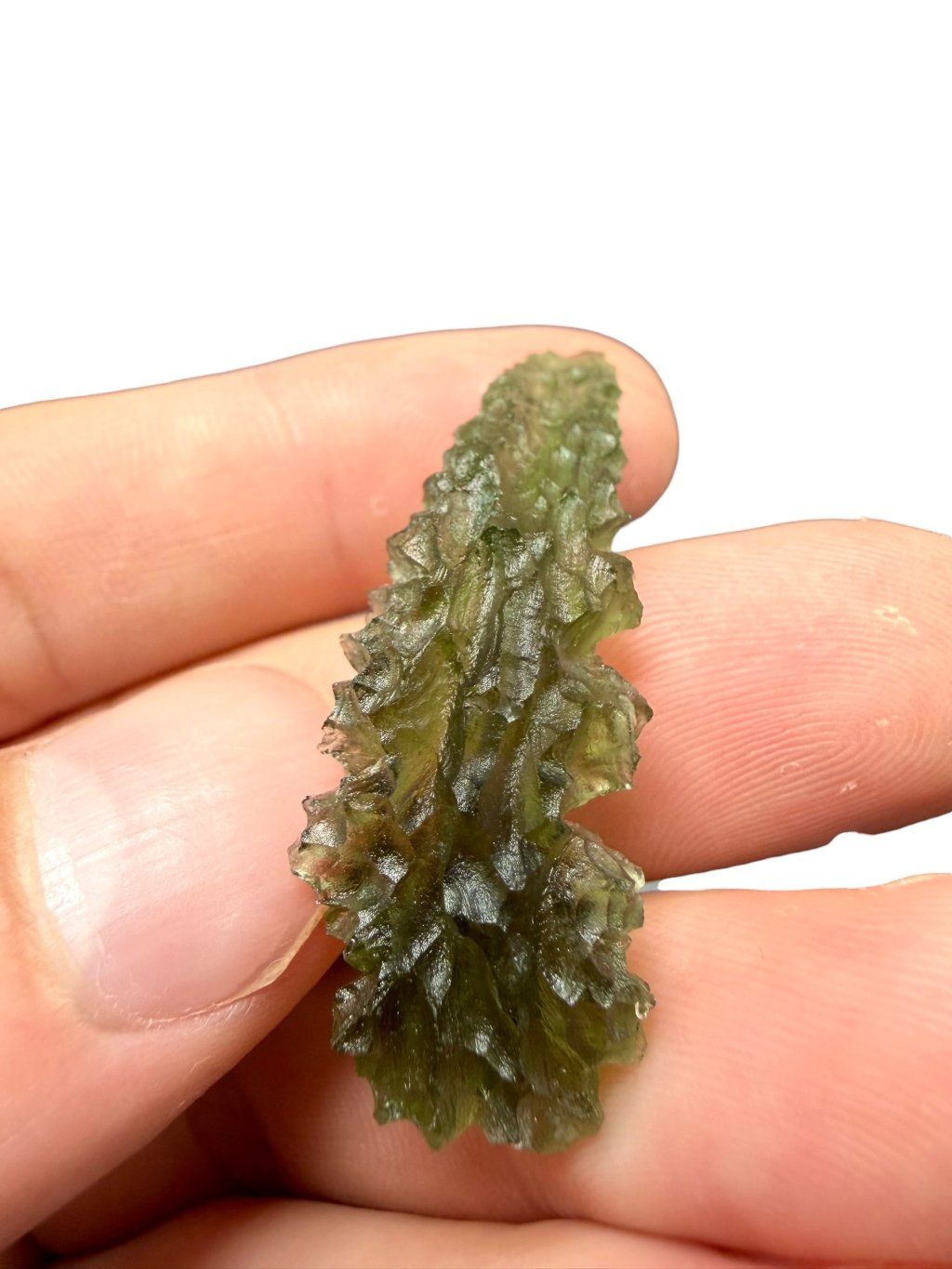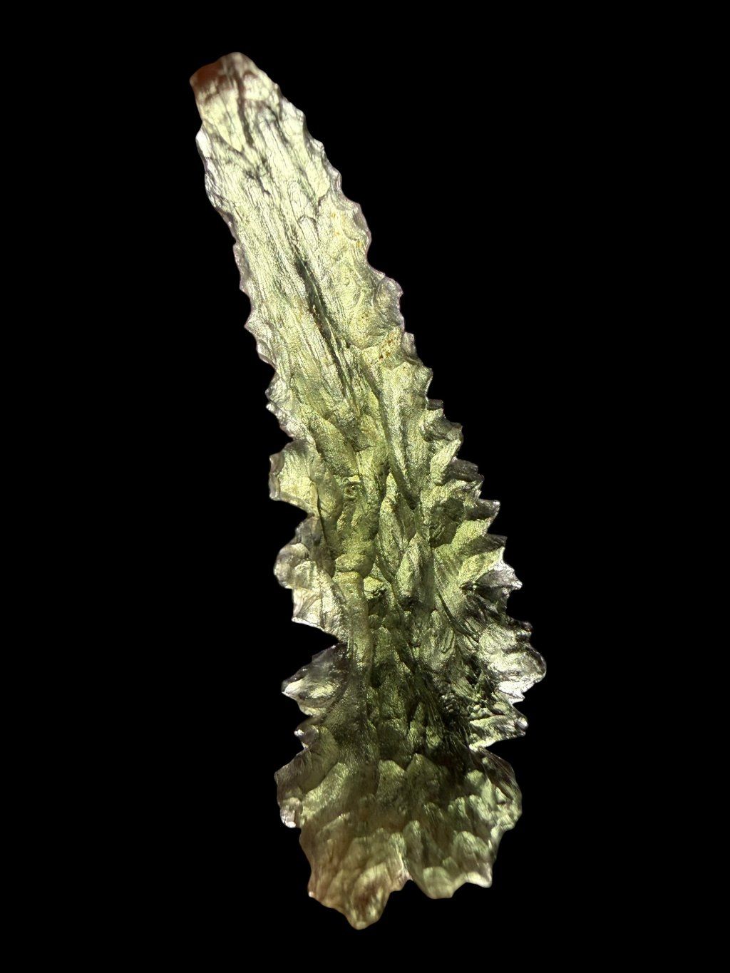 This moldavite comes from official mining in Besednice, where damage to the stones often occurred. The damaged glossy surfaces were then treated with acid to create a matte finish. These repaired moldavites are classified as lower quality, which is also reflected in their price, making them significantly cheaper and more affordable compared to undamaged moldavites. These stones are suitable both for jewellery and for collectors who appreciate a lower price for very beautiful pieces with the unique, deep structure of moldavites from the Besednice Jezkovna.