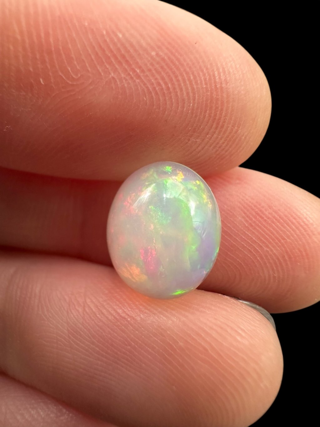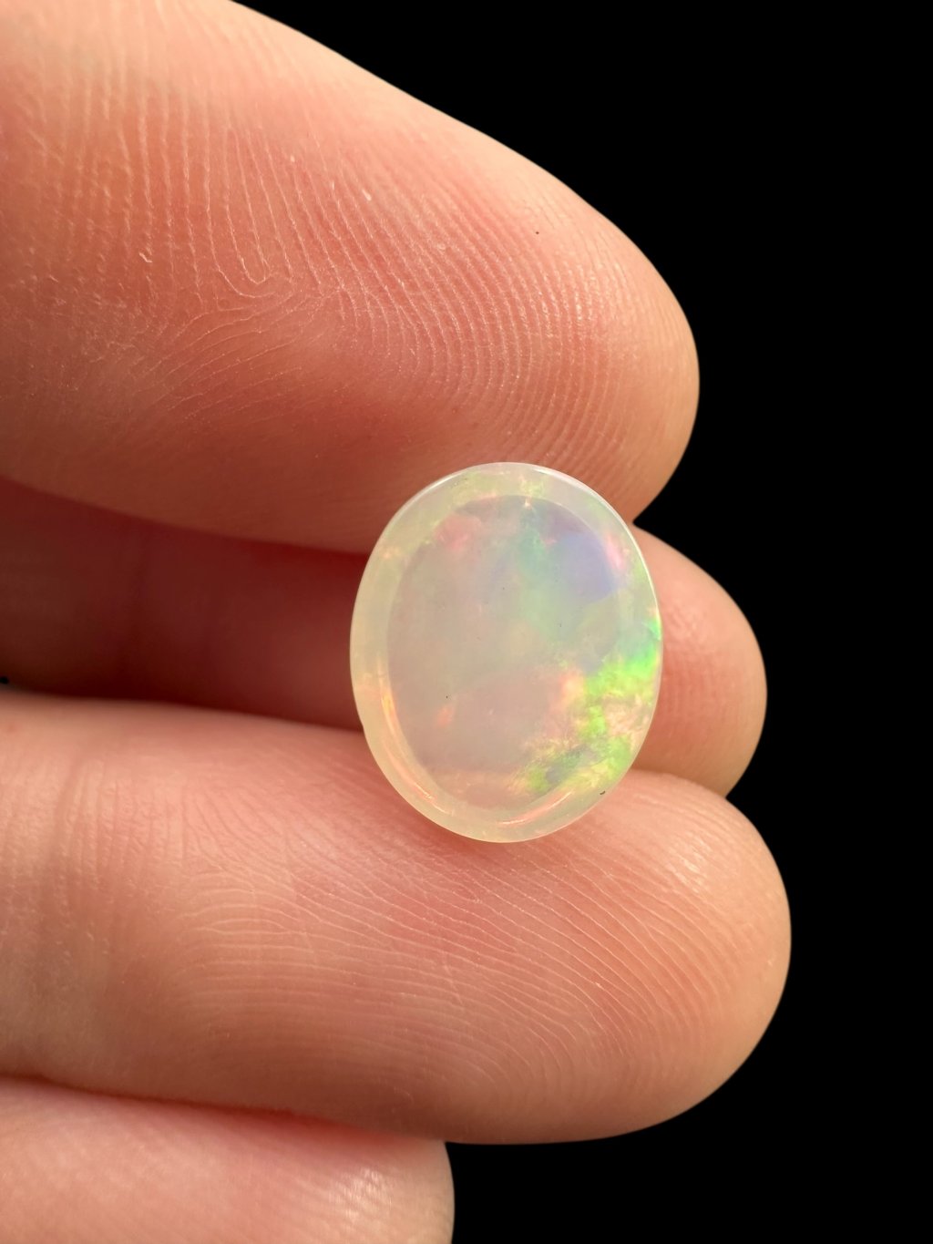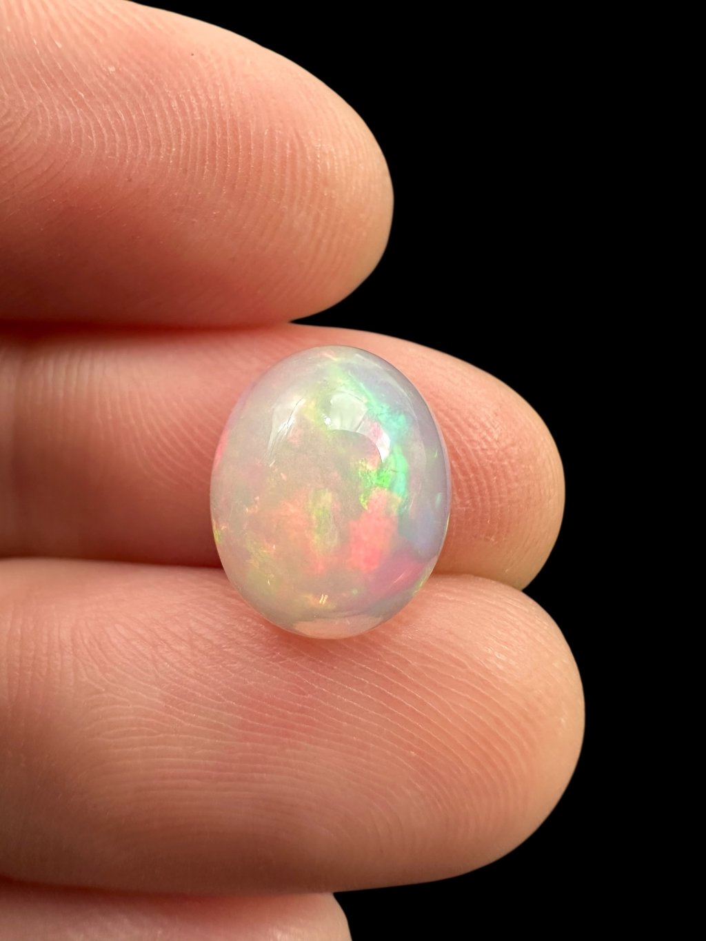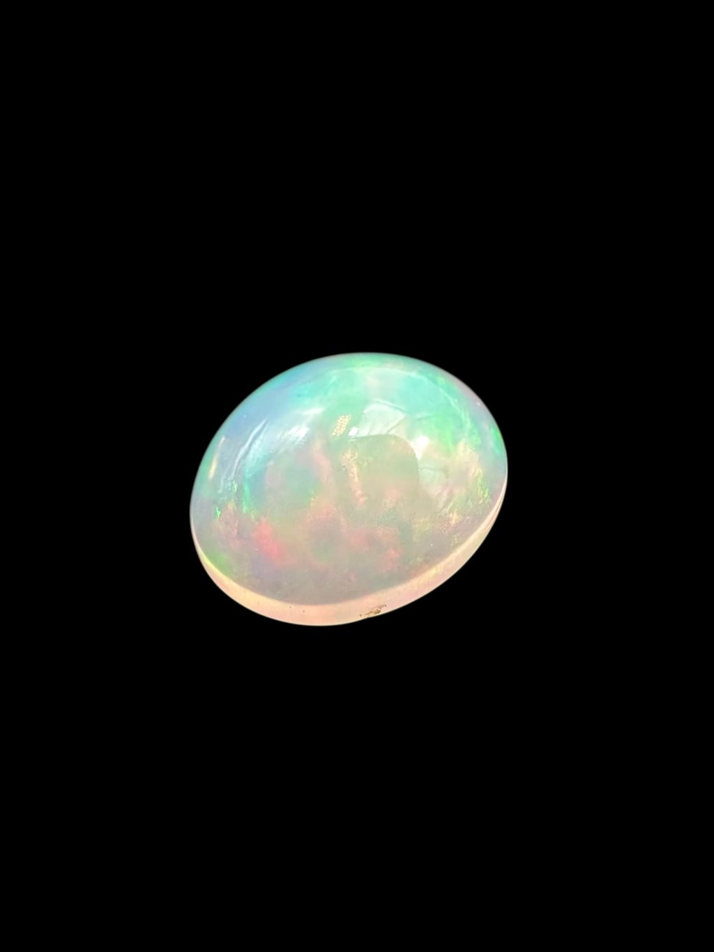 Ethiopian cabochons boast a wide range of colors—from light, milky whites through yellow and orange tones to intense red and green flashes. Many stones even display rare blue or violet play-of-color. Thanks to the cabochon shape, these colors flow smoothly across the domed surface.