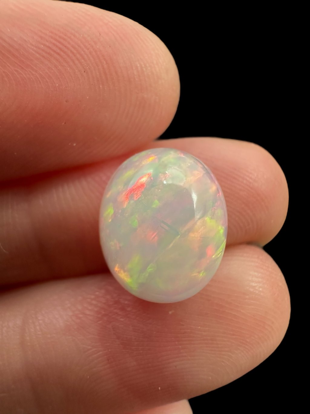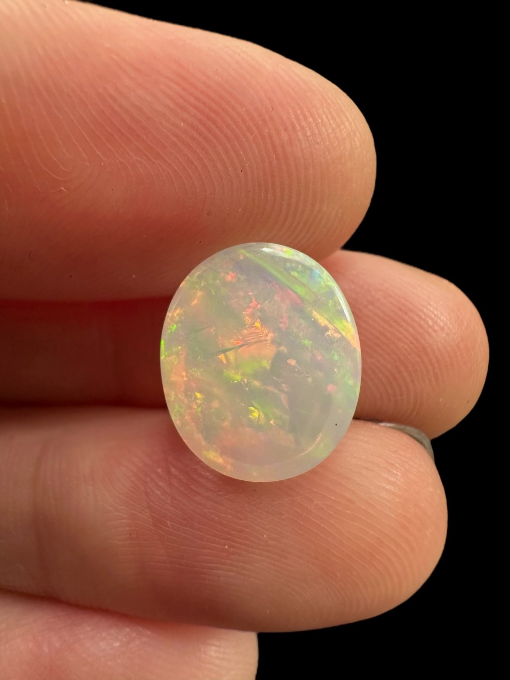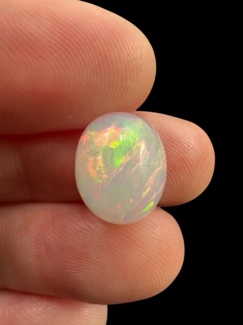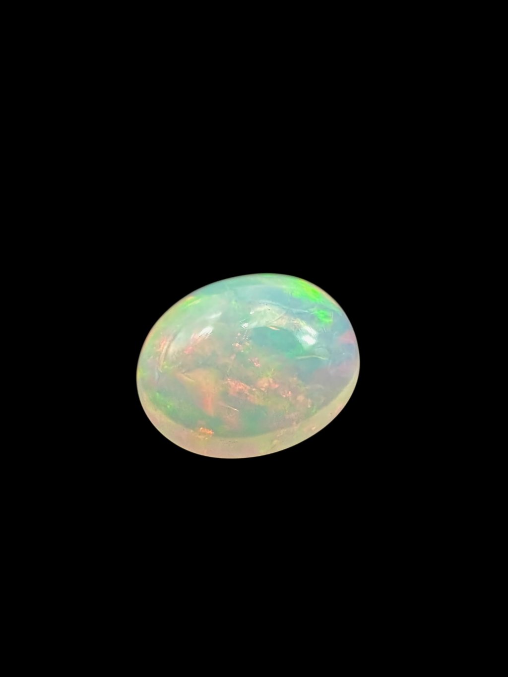 Ethiopian cabochons boast a wide range of colors—from light, milky whites through yellow and orange tones to intense red and green flashes. Many stones even display rare blue or violet play-of-color. Thanks to the cabochon shape, these colors flow smoothly across the domed surface.