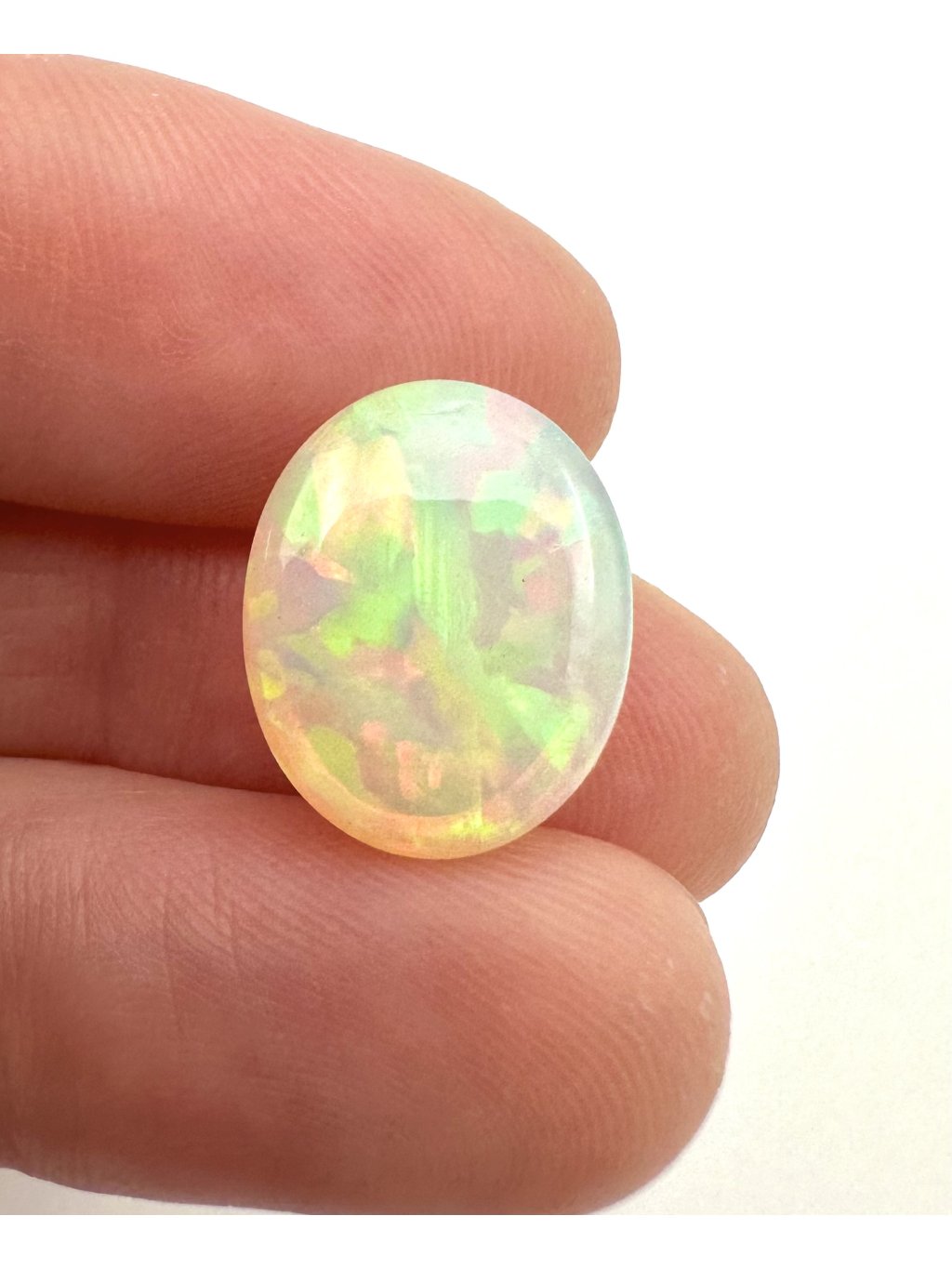 Ethiopian cabochons boast a wide range of colors—from light, milky whites through yellow and orange tones to intense red and green flashes. Many stones even display rare blue or violet play-of-color. Thanks to the cabochon shape, these colors flow smoothly across the domed surface.