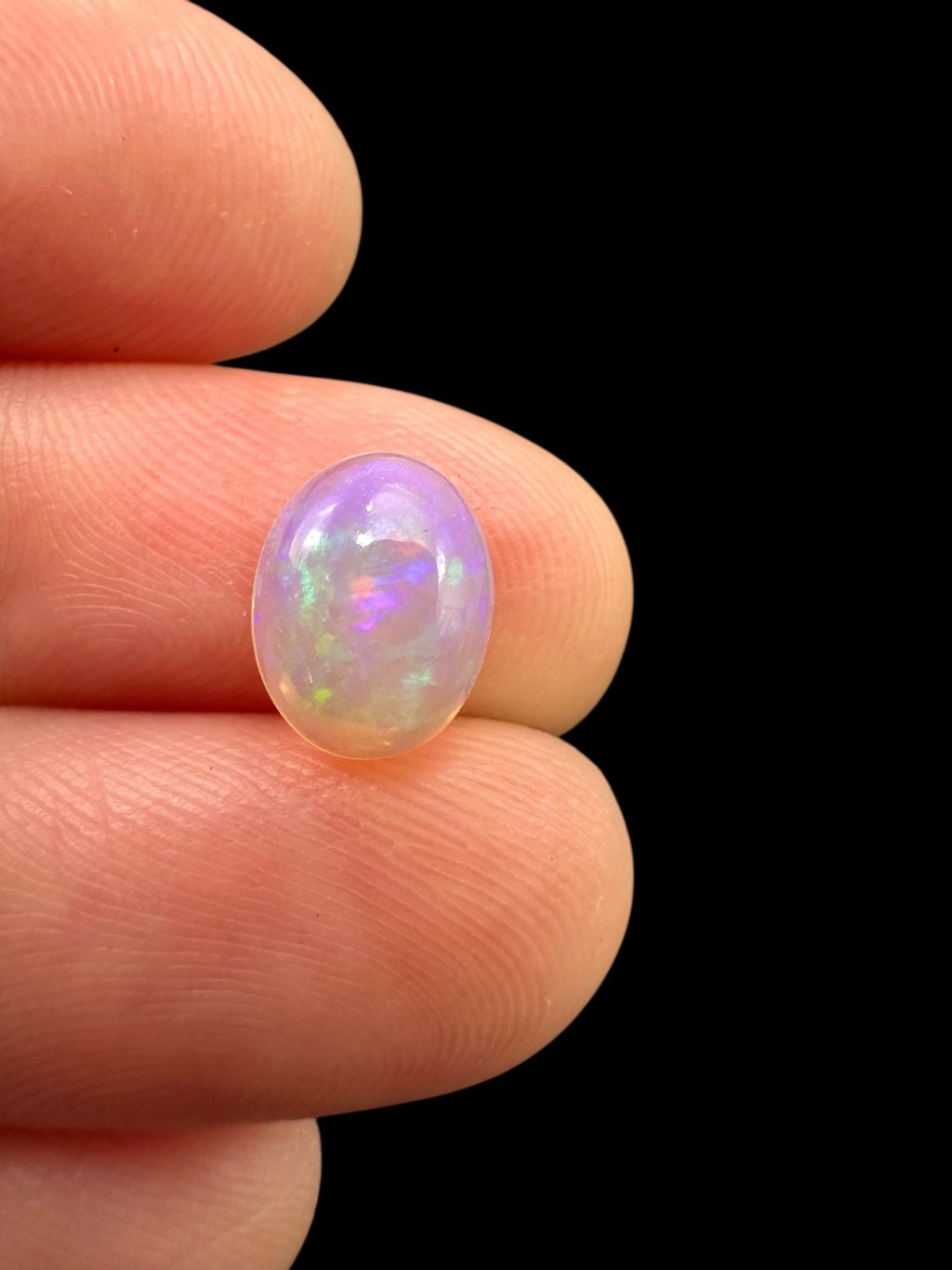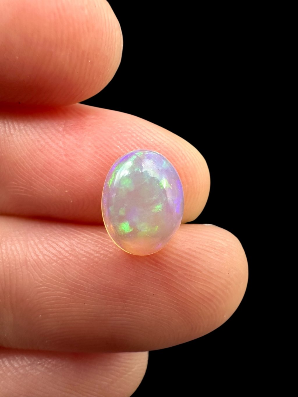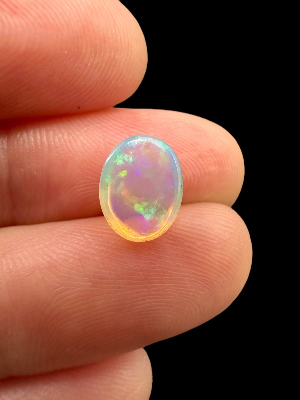 Ethiopian cabochons boast a wide range of colors—from light, milky whites through yellow and orange tones to intense red and green flashes. Many stones even display rare blue or violet play-of-color. Thanks to the cabochon shape, these colors flow smoothly across the domed surface.
