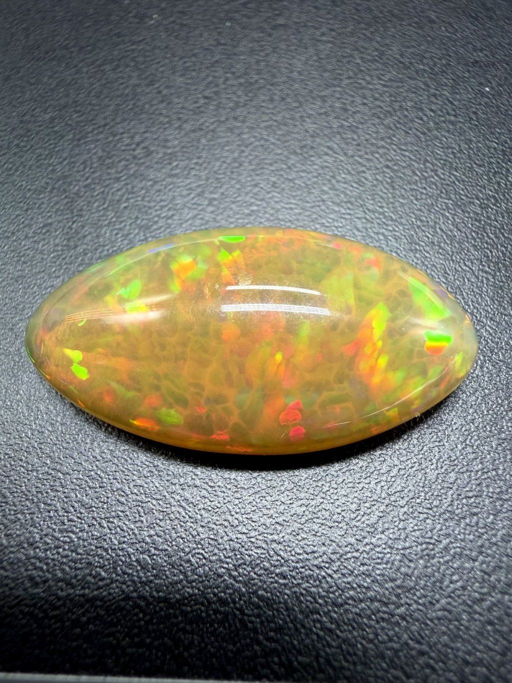 Ethiopian opal cabochons display a wide range of colors, from light milky white tones through yellow and orange hues to vivid red and green flashes. Some specimens also exhibit rare blue or violet play-of-color, which flows smoothly across the domed surface thanks to the cabochon cut.