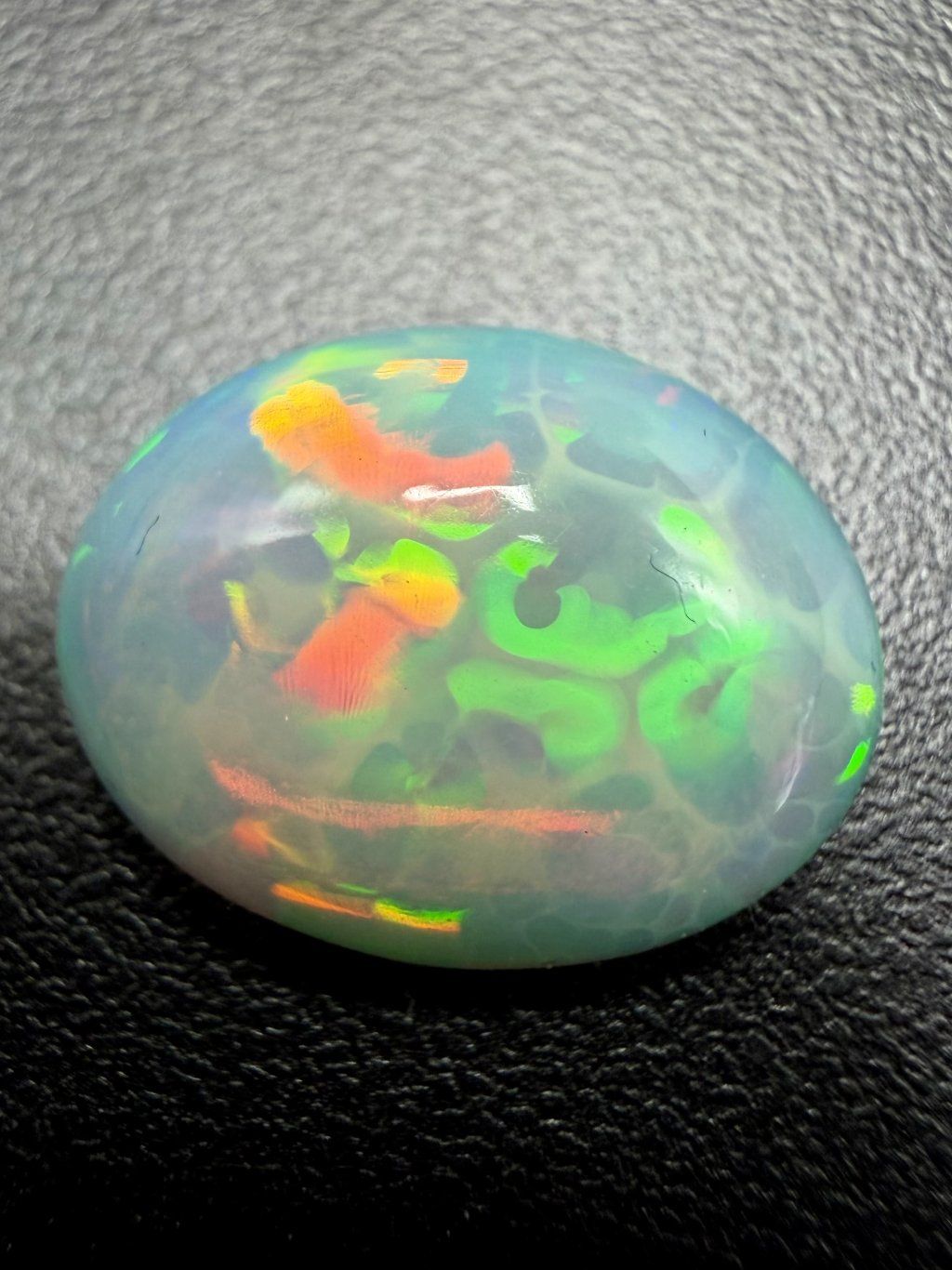 Ethiopian opal cabochons display a wide range of colors, from light milky white tones through yellow and orange hues to vivid red and green flashes. Some specimens also exhibit rare blue or violet play-of-color, which flows smoothly across the domed surface thanks to the cabochon cut.