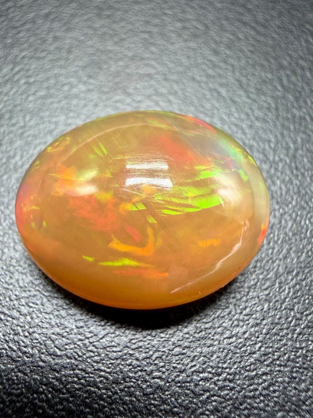 Ethiopian opal cabochons display a wide range of colors, from light milky white tones through yellow and orange hues to vivid red and green flashes. Some specimens also exhibit rare blue or violet play-of-color, which flows smoothly across the domed surface thanks to the cabochon cut.
