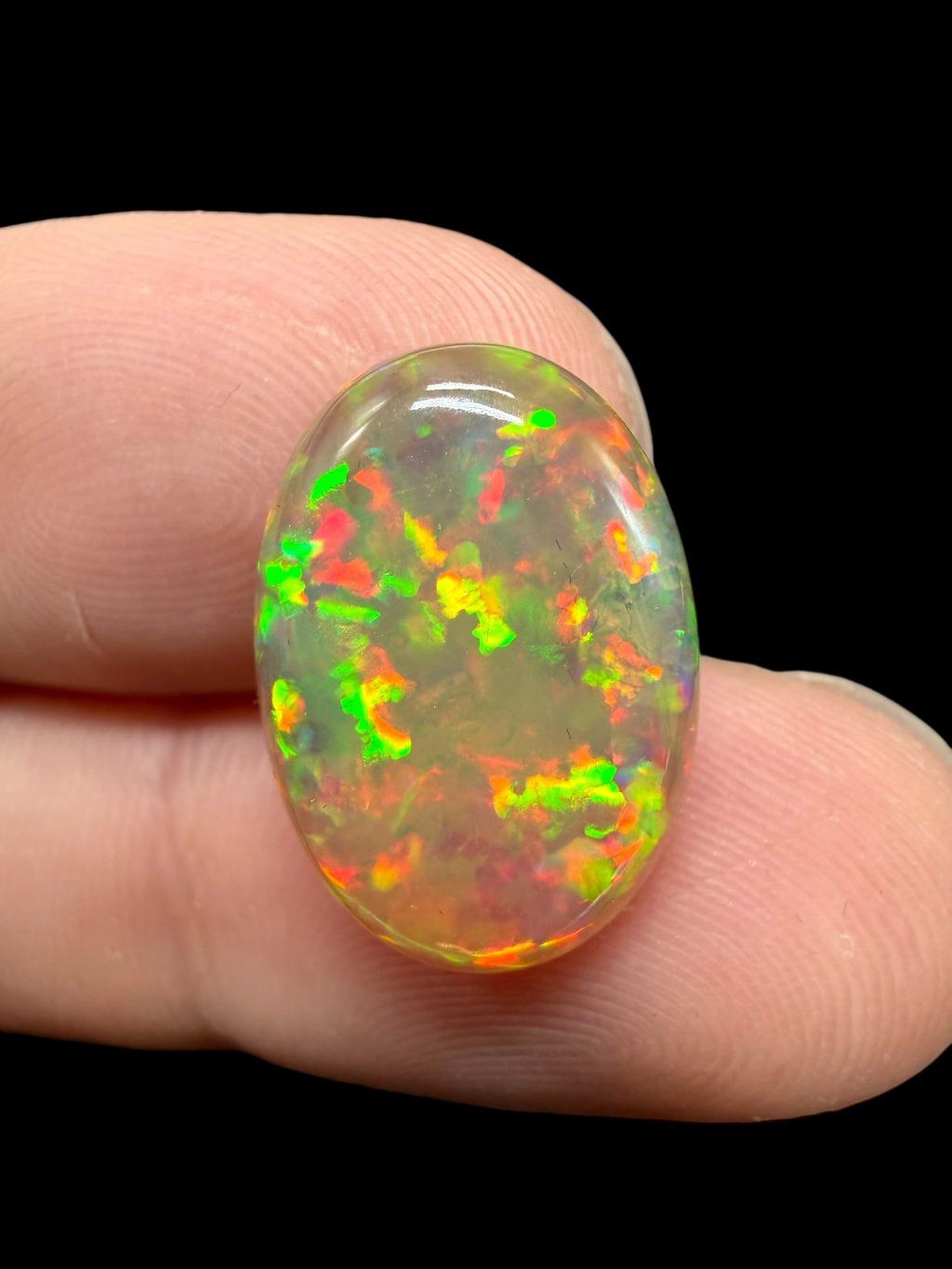Ethiopian opal cabochons display a wide range of colors, from light milky white tones through yellow and orange hues to vivid red and green flashes. Some specimens also exhibit rare blue or violet play-of-color, which flows smoothly across the domed surface thanks to the cabochon cut.