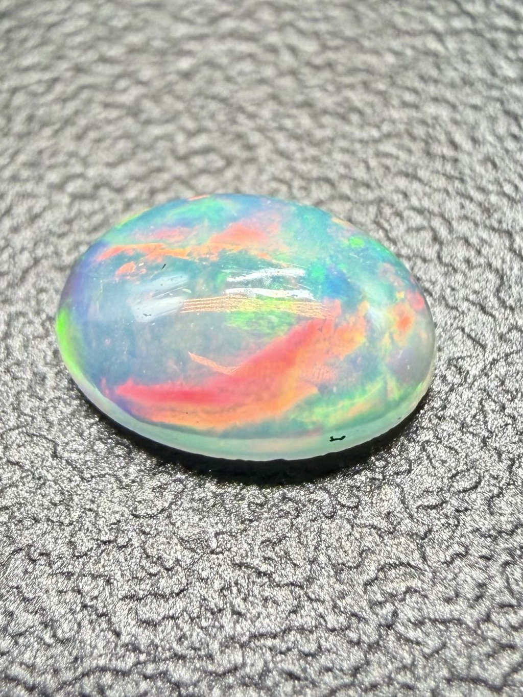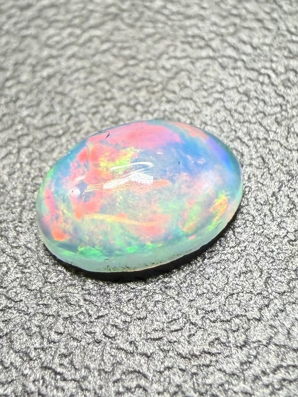 Ethiopian opal cabochons display a wide range of colors, from light milky white tones through yellow and orange hues to vivid red and green flashes. Some specimens also exhibit rare blue or violet play-of-color, which flows smoothly across the domed surface thanks to the cabochon cut.