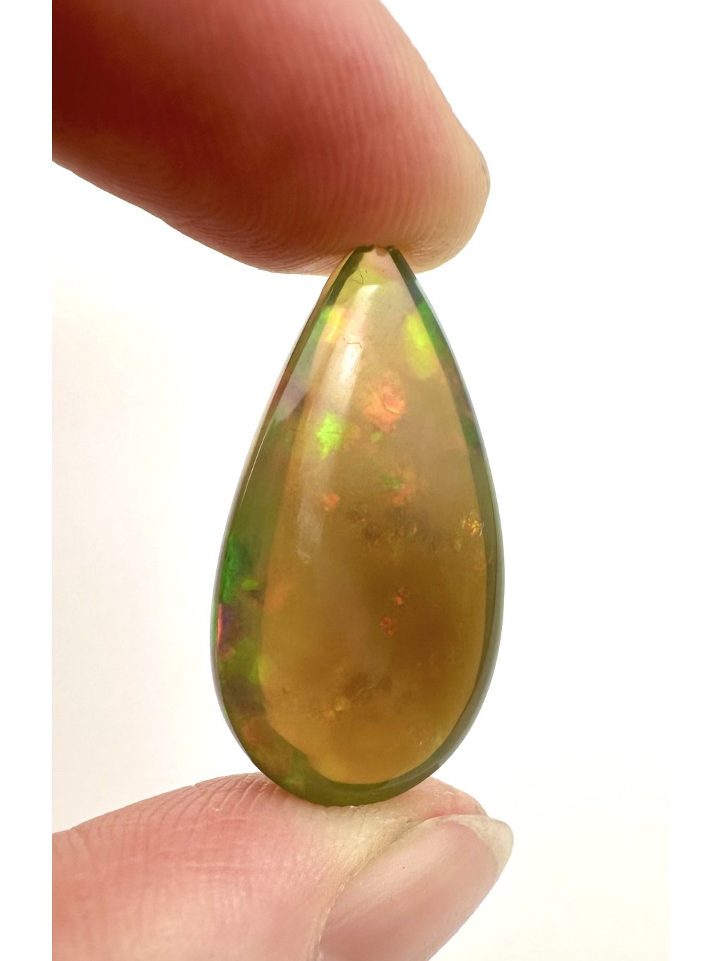 Ethiopian cabochons boast a wide range of colors—from light, milky whites through yellow and orange tones to intense red and green flashes. Many stones even display rare blue or violet play-of-color. Thanks to the cabochon shape, these colors flow smoothly across the domed surface.