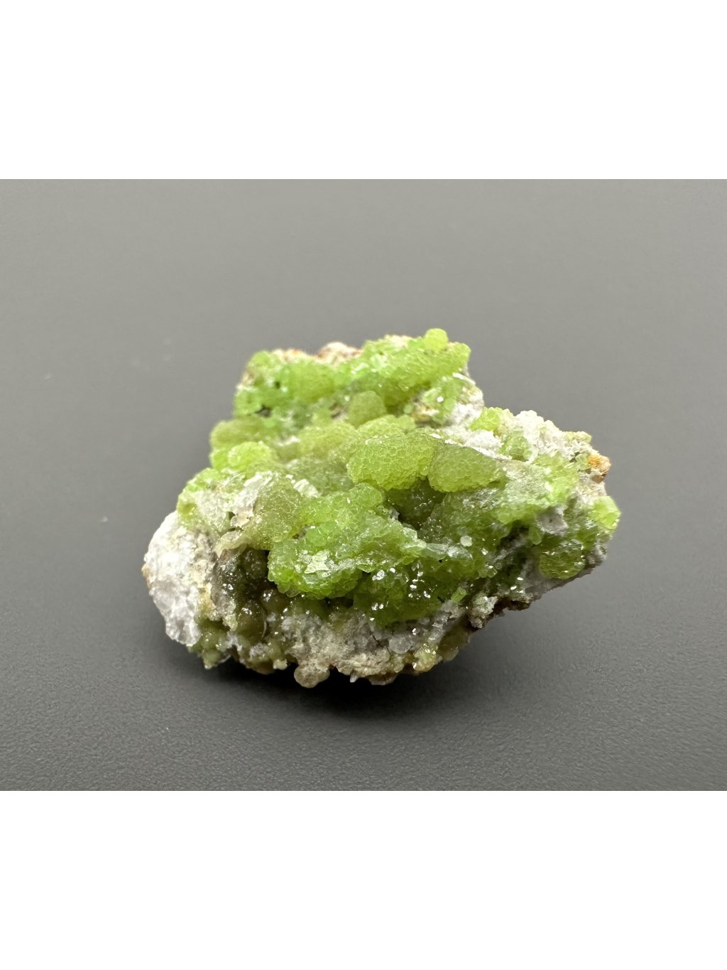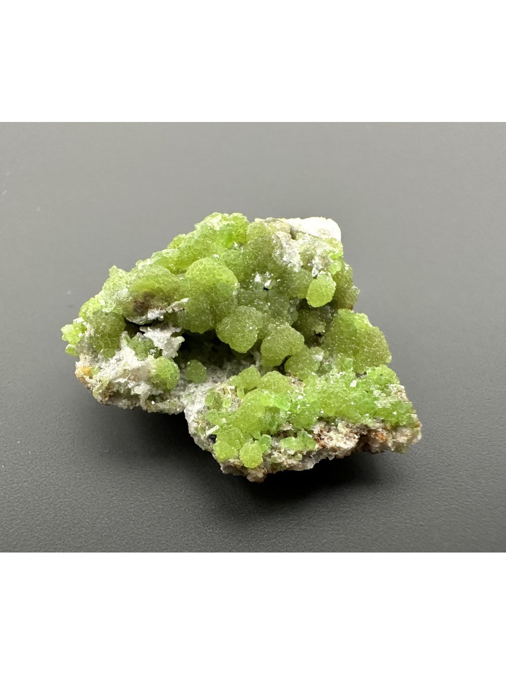 Pyromorphite occurs in a wide range of colours, from bright yellow, green, brown to orange. The green and yellow varieties are the most common and most popular among collectors. They form characteristic needle-shaped or cylindrical crystals which can reach different sizes. Pyromorphite is sometimes found in grape-like or spherical aggregates. It has a glassy to resinous lustre, which contributes to its attractive appearance.
