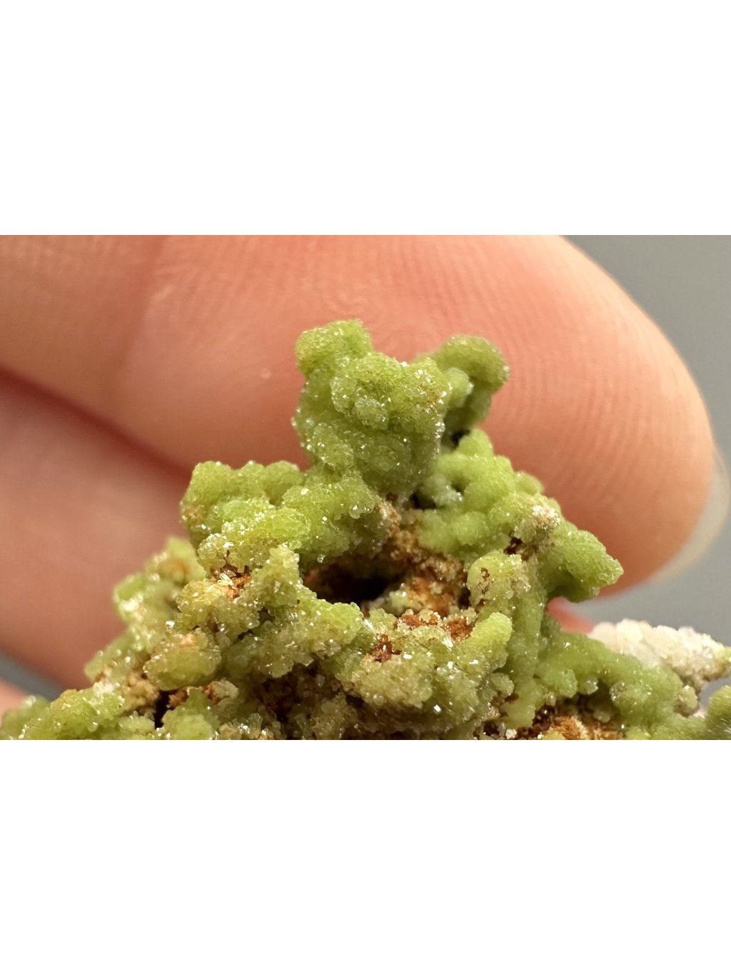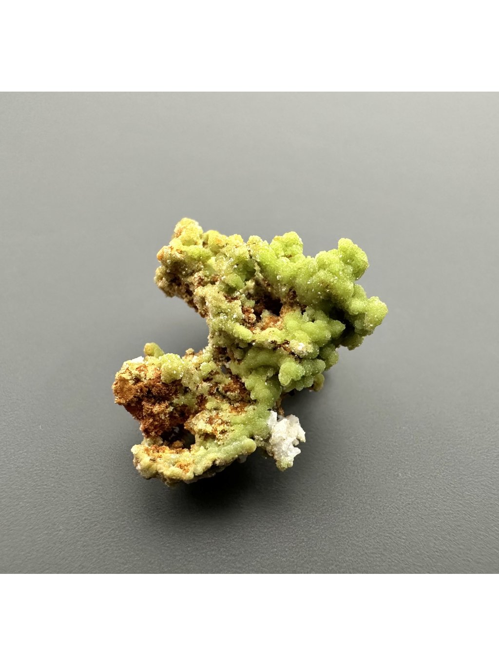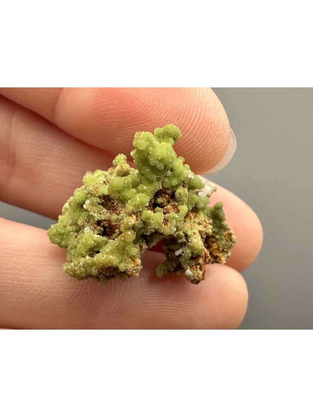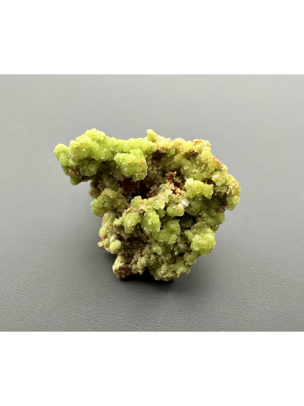 Pyromorphite occurs in a wide range of colours, from bright yellow, green, brown to orange. The green and yellow varieties are the most common and most popular among collectors. They form characteristic needle-shaped or cylindrical crystals which can reach different sizes. Pyromorphite is sometimes found in grape-like or spherical aggregates. It has a glassy to resinous lustre, which contributes to its attractive appearance.