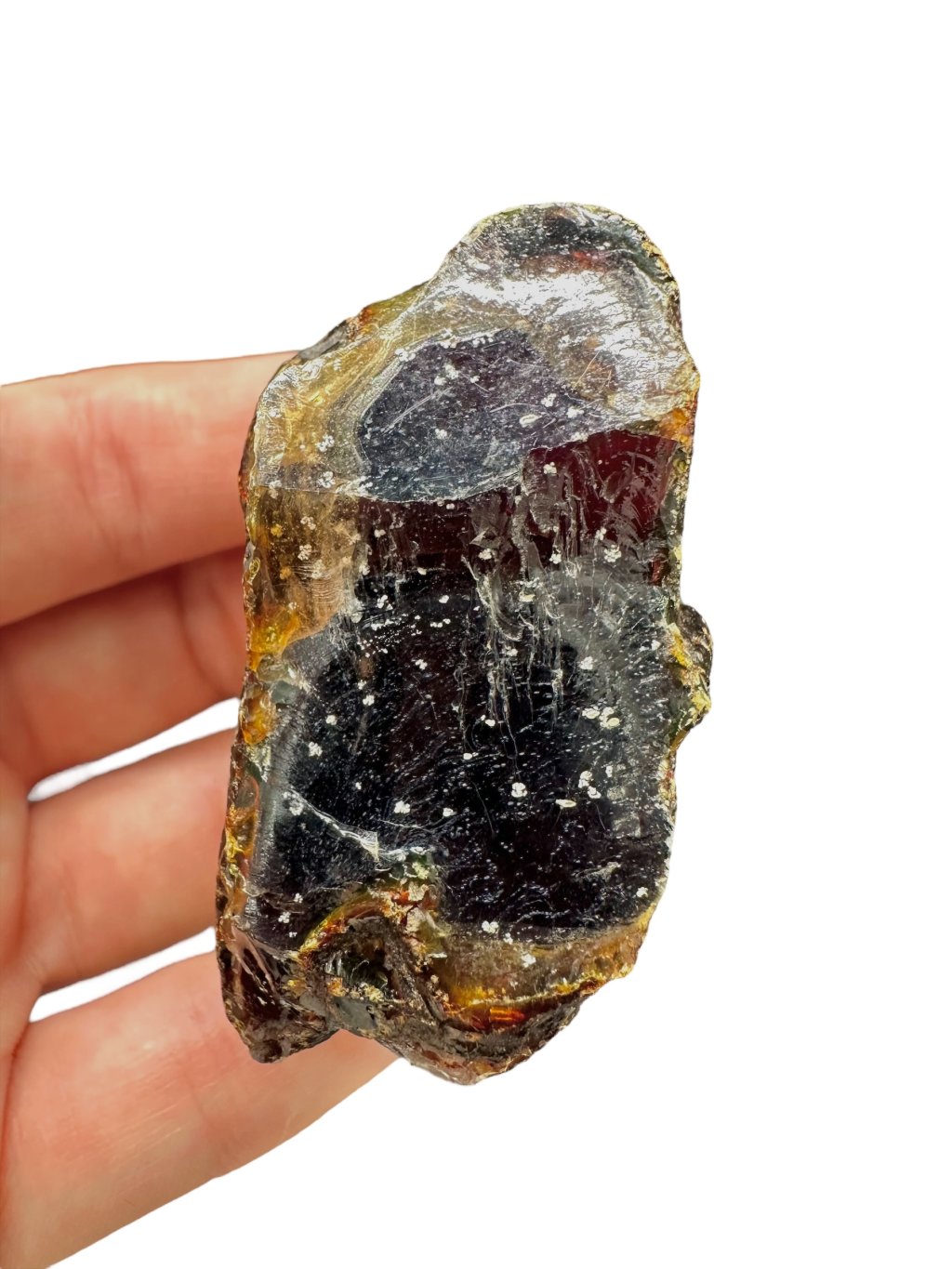 Indonesian amber has a hardness of about 2 to 2.5 on the Mohs scale, making it relatively soft and easily scratched. Its density ranges between 1.05 and 1.10 g/cm³, which is why it often floats in salt water. Chemically, it contains less succinic acid than Baltic amber, setting it apart.