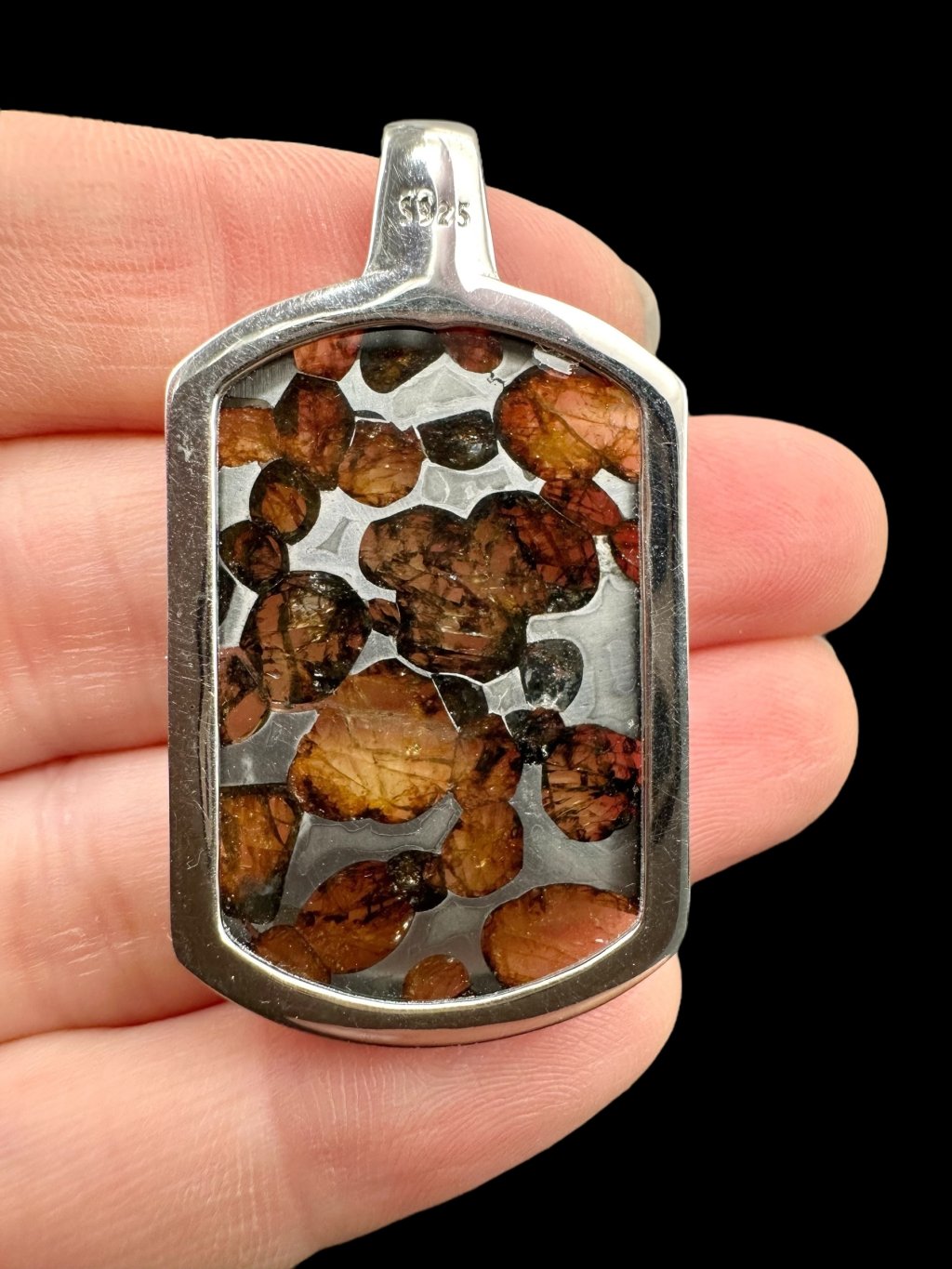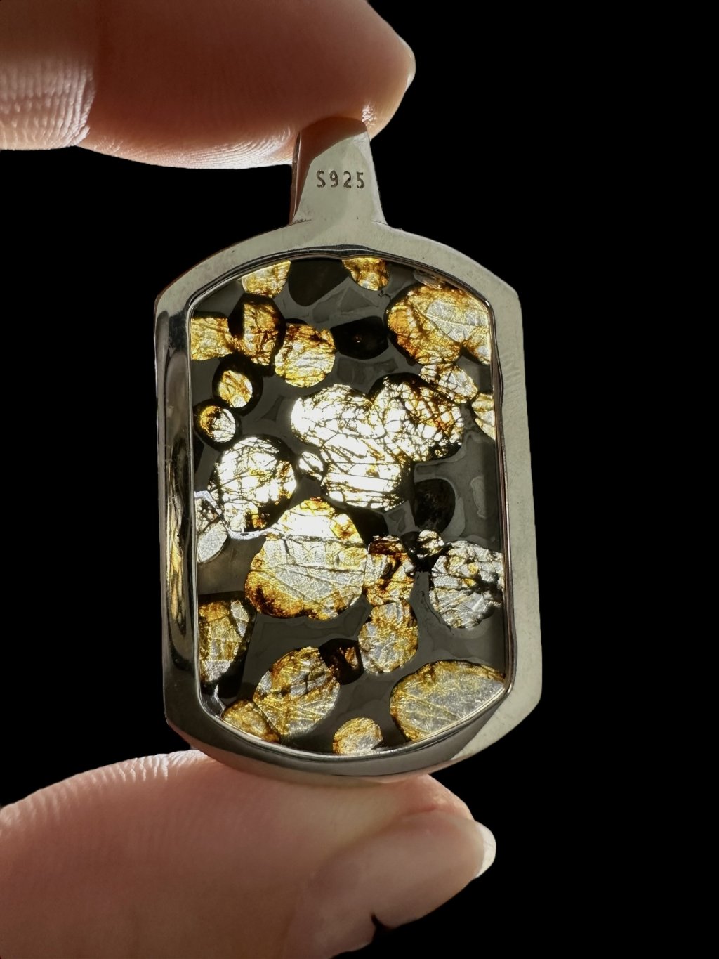 Material used to fix the meteorite to the jewel: Silver-plated metal, unhallmarked, sealed with resin