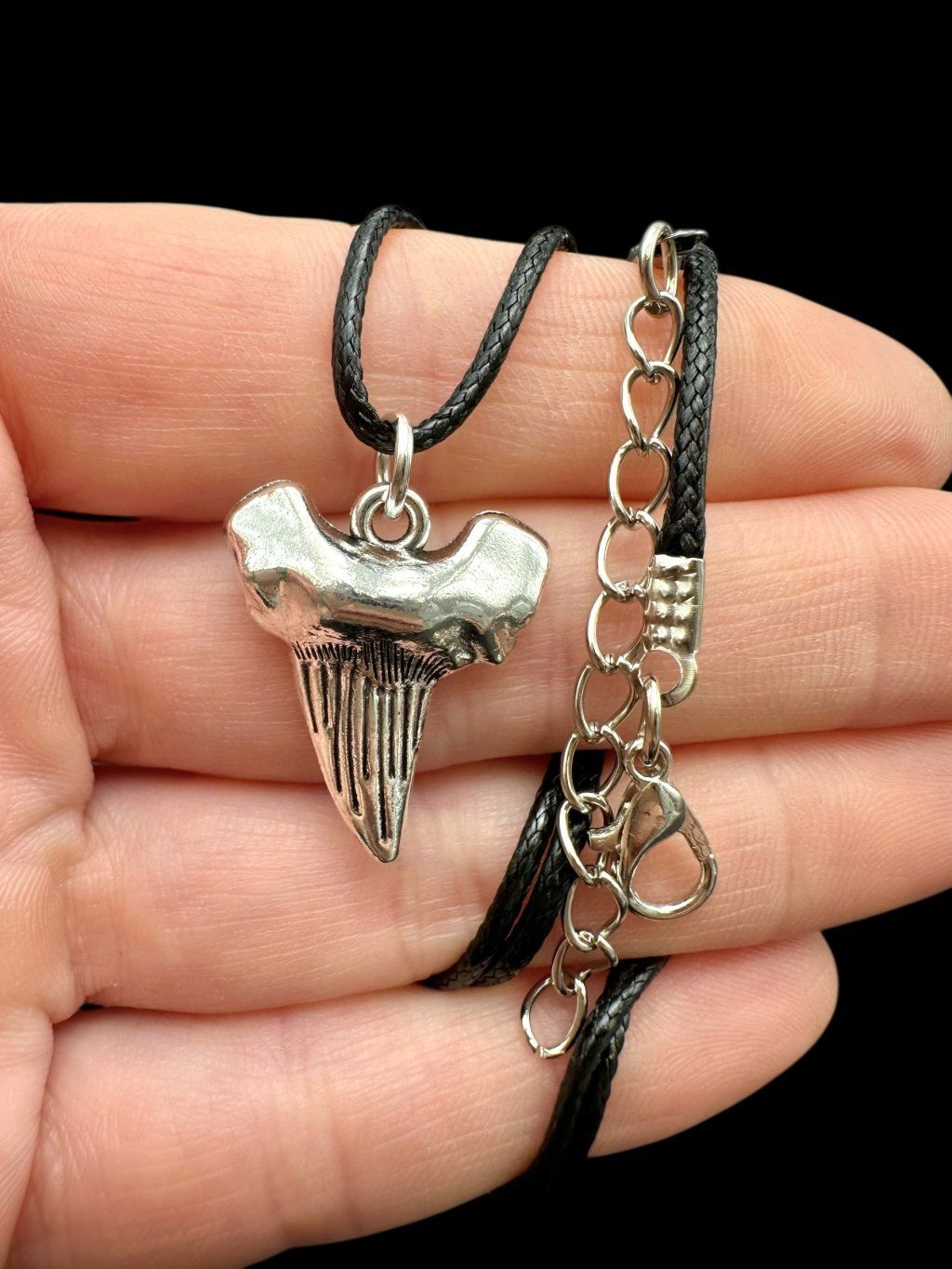 Note: This item is not a mineral or a fossil; it is a metal pendant designed in the shape of a shark tooth.