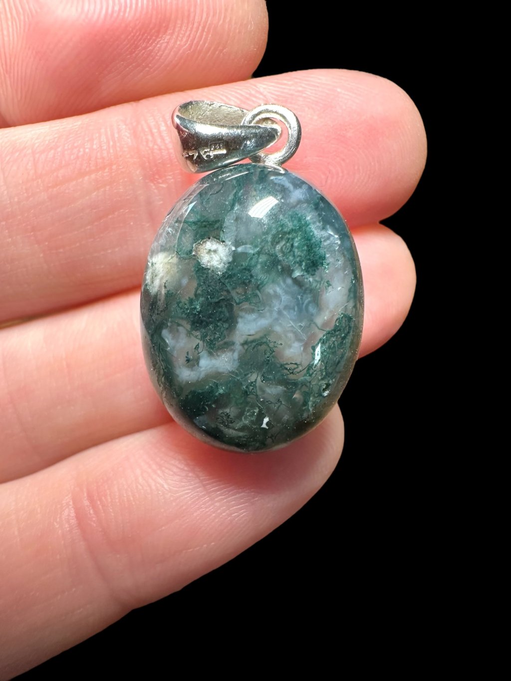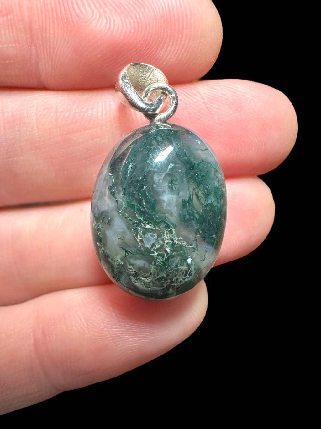 Moss agate is a fascinating and visually attractive variety of chalcedony, a cryptocrystalline form of quartz. Unlike typical agates, it lacks concentric banding and instead features characteristic dendritic inclusions that resemble moss, fern leaves, or tree branches. These patterns are not of organic origin – they are formed by iron and manganese oxides that spread throughout the stone during its formation. Moss agates typically appear translucent to milky white with inclusions in shades of green, brown, black, or red.