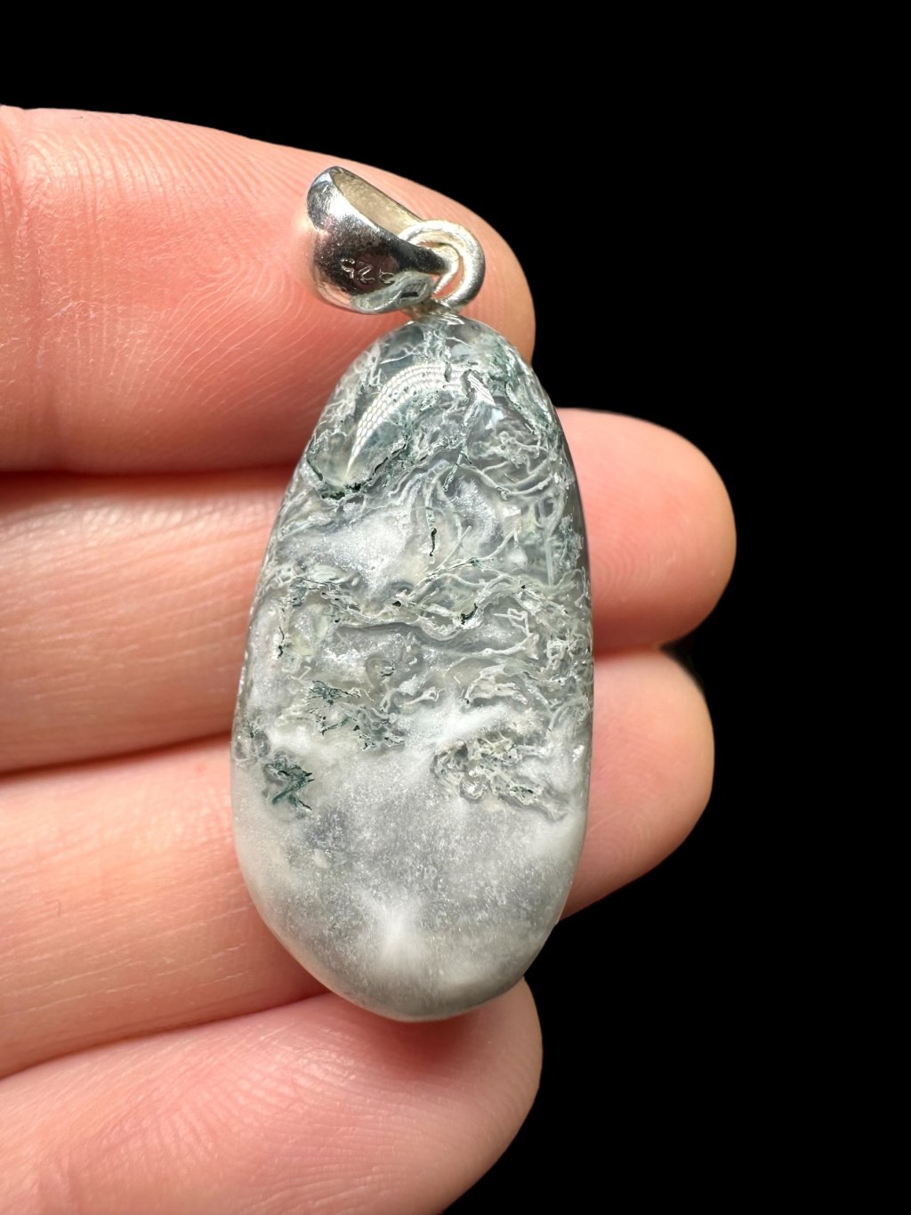 Moss agate is a fascinating and visually attractive variety of chalcedony, a cryptocrystalline form of quartz. Unlike typical agates, it lacks concentric banding and instead features characteristic dendritic inclusions that resemble moss, fern leaves, or tree branches. These patterns are not of organic origin – they are formed by iron and manganese oxides that spread throughout the stone during its formation. Moss agates typically appear translucent to milky white with inclusions in shades of green, brown, black, or red.