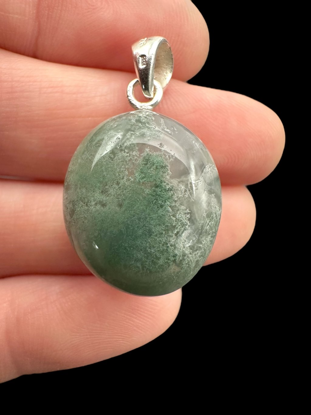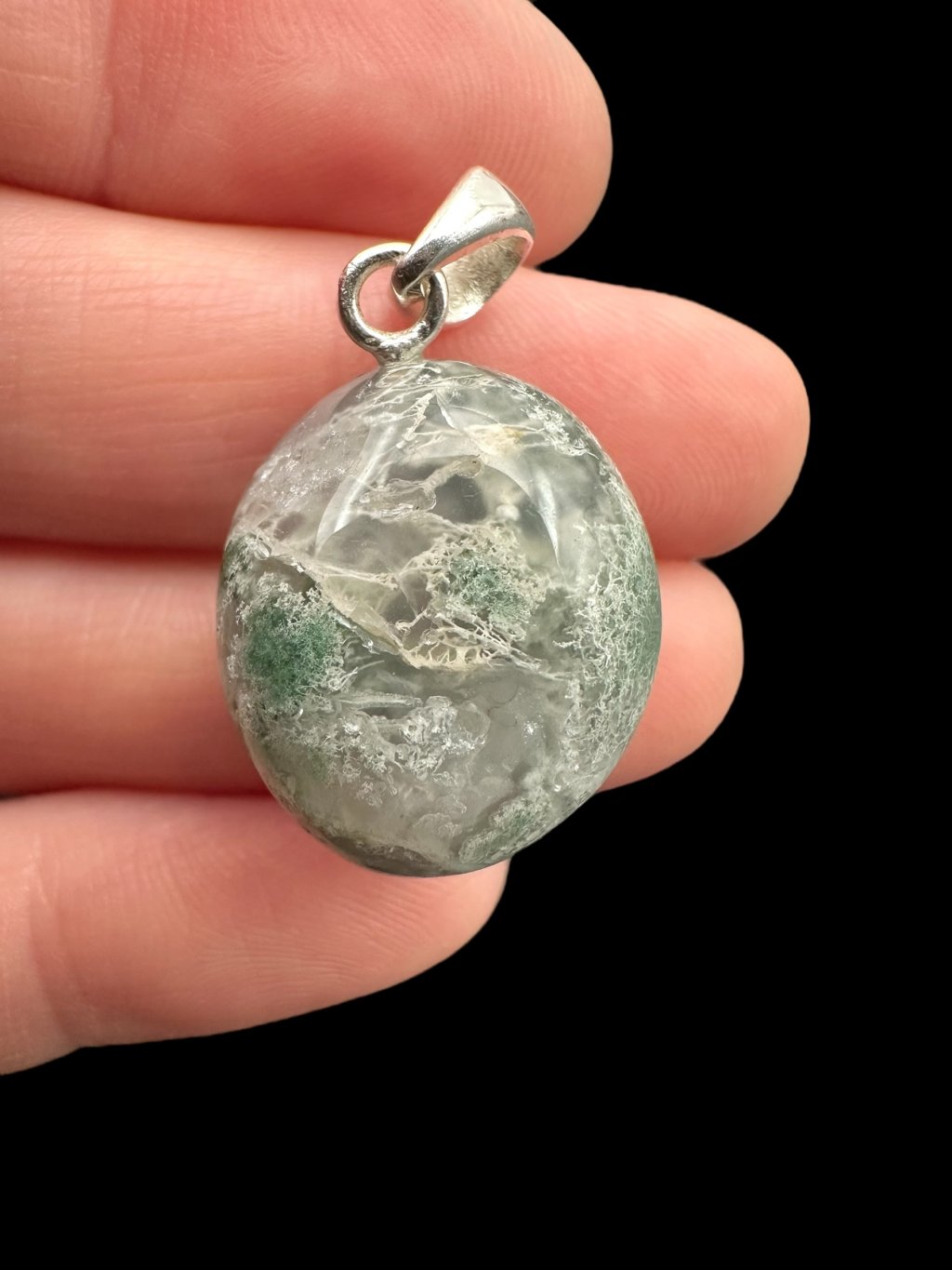 Moss agate is a fascinating and visually attractive variety of chalcedony, a cryptocrystalline form of quartz. Unlike typical agates, it lacks concentric banding and instead features characteristic dendritic inclusions that resemble moss, fern leaves, or tree branches. These patterns are not of organic origin – they are formed by iron and manganese oxides that spread throughout the stone during its formation. Moss agates typically appear translucent to milky white with inclusions in shades of green, brown, black, or red.