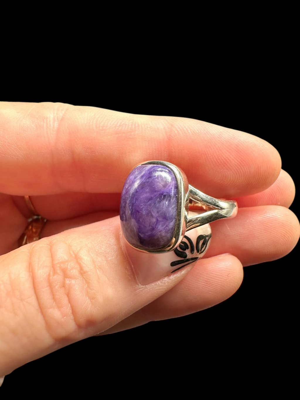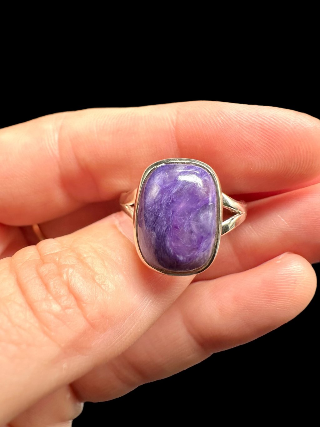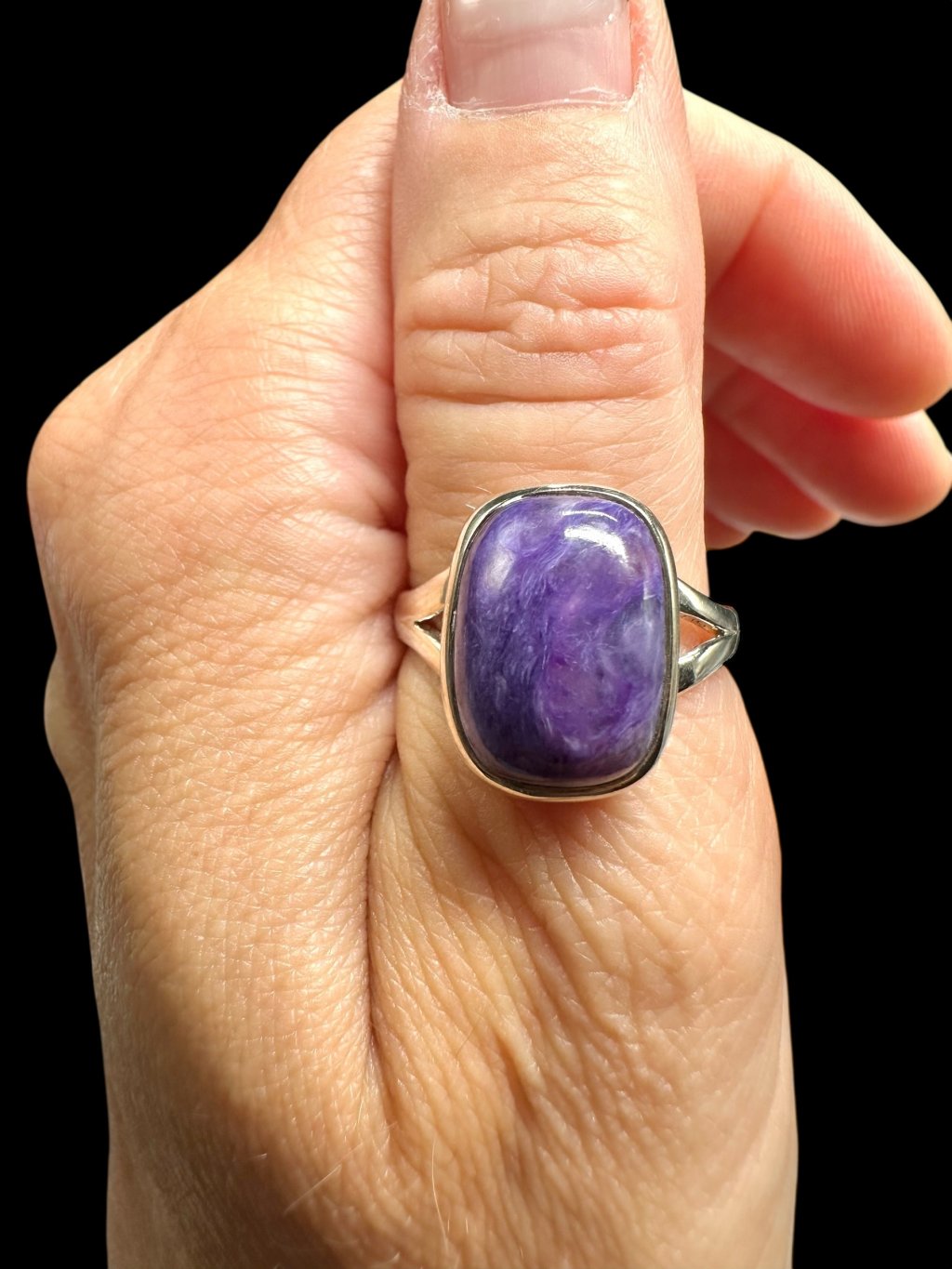 Silver ring made of charoit