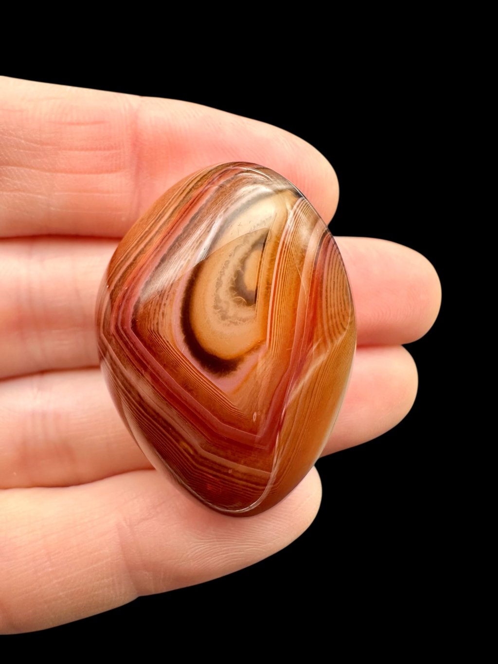 The red and orange shades of agates are caused by the presence of iron oxides, especially the minerals hematite and goethite. These minerals occur naturally within the agate and give it its characteristic coloration. The intensity of the color depends on the concentration of iron and the conditions under which the stone formed.